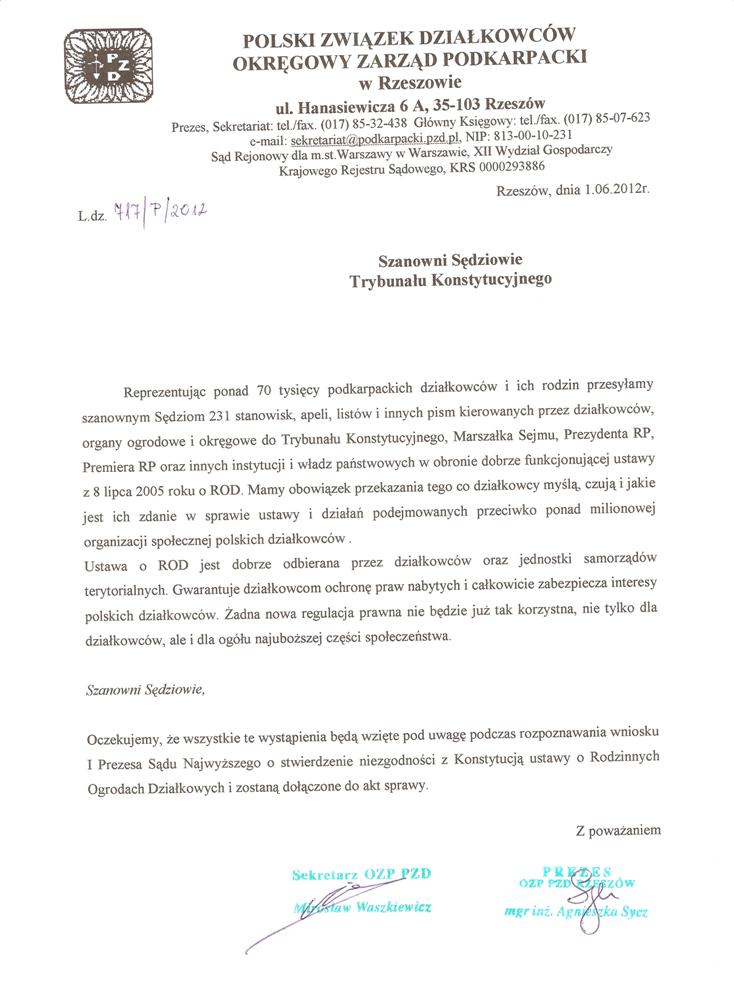 Okręgowy Zarząd Podkarpacki PZD w Rzeszowie przesłał - jako załącznik do pisma - 231 stanowisk, apeli, listów do Sędziów Trybunału Konstytucyjnego.