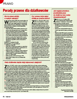 ● W rubryce „Porady prawne dla działkowców” podajemy wyjaśnienia najważniejszych i aktualnych kwestii prawnych związanych z użytkowaniem działki i członkostwem w Związku. W tym numerze odpowiemy m.in. na pytania „Kto ma prawo udziału w walnym zebraniu?”, „Jak wygląda procedura przeniesienia praw do działki na rzecz osoby niespokrewnionej?”.