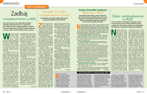 ● Chcecie być na bieżąco? Czytajcie „Wiadomości”! „Tylko w działkowcu” znajdziecie aktualne informacje na temat wydarzeń w Związku i w ogrodach! W tym numerze m.in.: „Zadbaj o bezpieczeństwo w ROD”, „Porządek na działce a wypowiedzenie umowy”, „Znamy laureatów konkursu »Reportaż z ROD«!”, „Zakaz zamieszkiwania w ROD”.