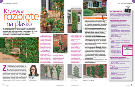 ● Na małej działce każdy centymetr powierzchni jest na wagę złota. Warto więc spróbować uprawy krzewów rozpiętych na płasko np. przy ścianie altany. Przedstawiamy różne techniki uprawy przyściennej, m.in. w układzie symetrycznym (espaliera), a także skośnym, kandelabrowym, parasolowatym lub wachlarzowym. Doradzamy też, które gatunki roślin (owocowych i ozdobnych) oraz w jaki sposób można z sukcesem prowadzić w tej formie!