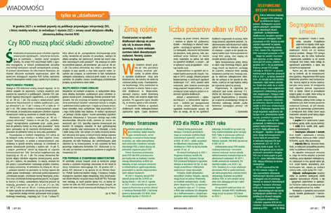 ● Chcecie być na bieżąco? Czytajcie „Wiadomości”! „Tylko w działkowcu” znajdziecie aktualne informacje na temat wydarzeń w Związku i w ogrodach! W tym numerze: „Czy ROD muszą płacić składki zdrowotne?”, „Pomoc finansowa PZD dla ROD w 2021 roku”, „Zimą rośnie liczba pożarów altan w ROD”, „Segregowanie śmieci to oszczędność i troska o środowisko naturalne”, „Telefoniczne dyżury prawne w Jednostce Krajowej i okręgach PZD”.