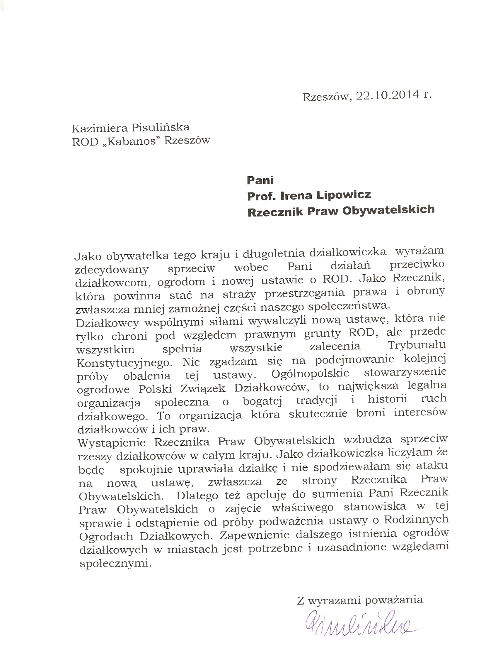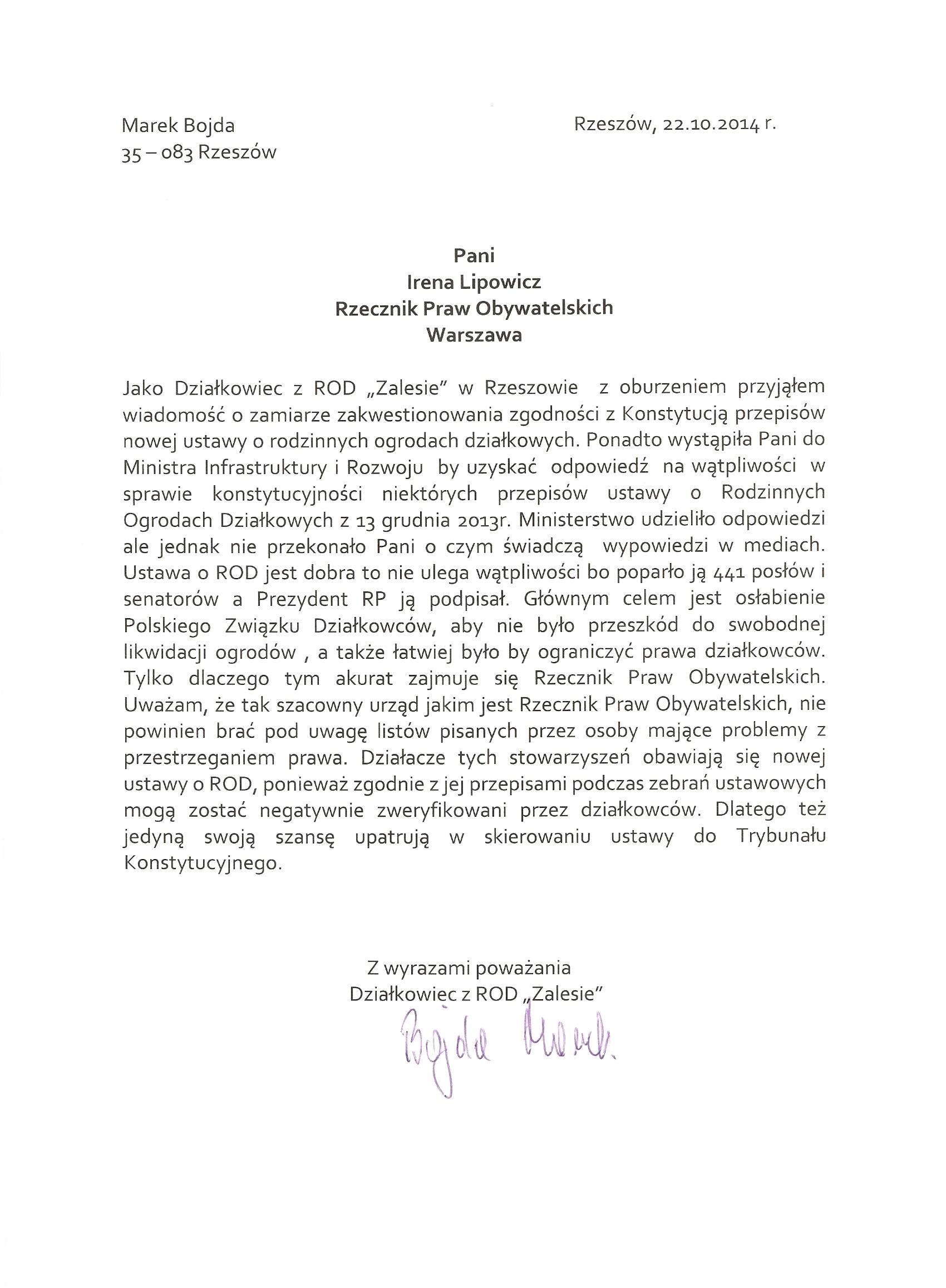 "Uważam, że tak szacowny urząd jakim jest Rzecznik Praw Obywatelskich nie powinien brać pod uwagę listów pisanych przez osoby mające problemy z przestrzeganiem prawa" - pisze do Rzecznika Praw Obywatelskich Marek Bojda z ROD "Zalesie" w Rzeszowie.