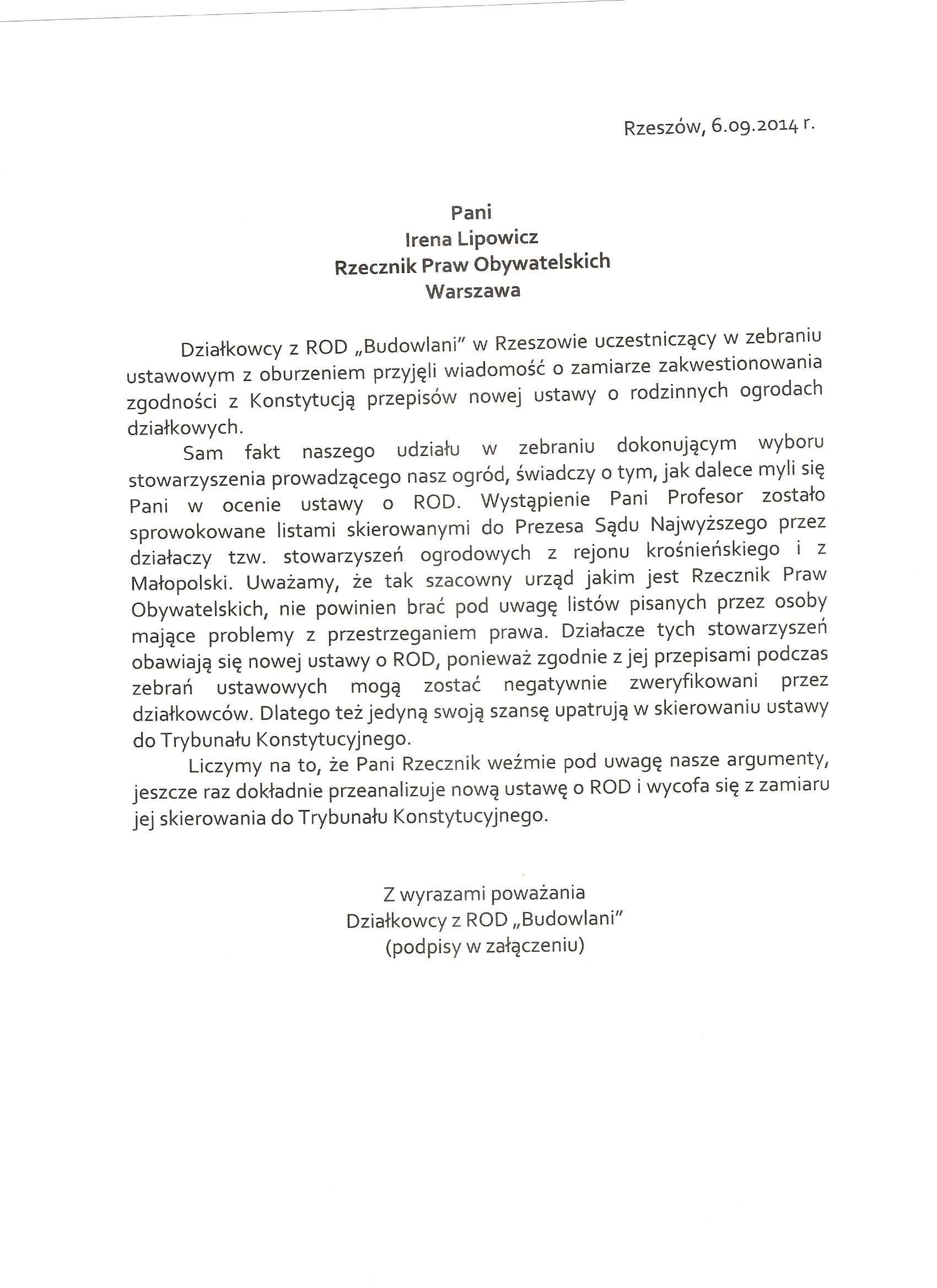 "Sam fakt naszego udziału w zebraniu dokonującym wyboru stowarzyszenia prowadzącego nasz ogród, świadczy o tym, jak dalece myli się Pani w ocenie ustawy o ROD. Wystąpienie Pani Profesor zostało sprowokowane listami skierowanymi do Prezesa Sądu Najwyższego przez działaczy tzw. stowarzyszeń ogrodowych z rejonu krośnieńskiego i z Małopolski. (...)" - piszą działkowcy w swoim liście do Rzecznika Praw Obywatelskich p. Ireny Lipowicz.