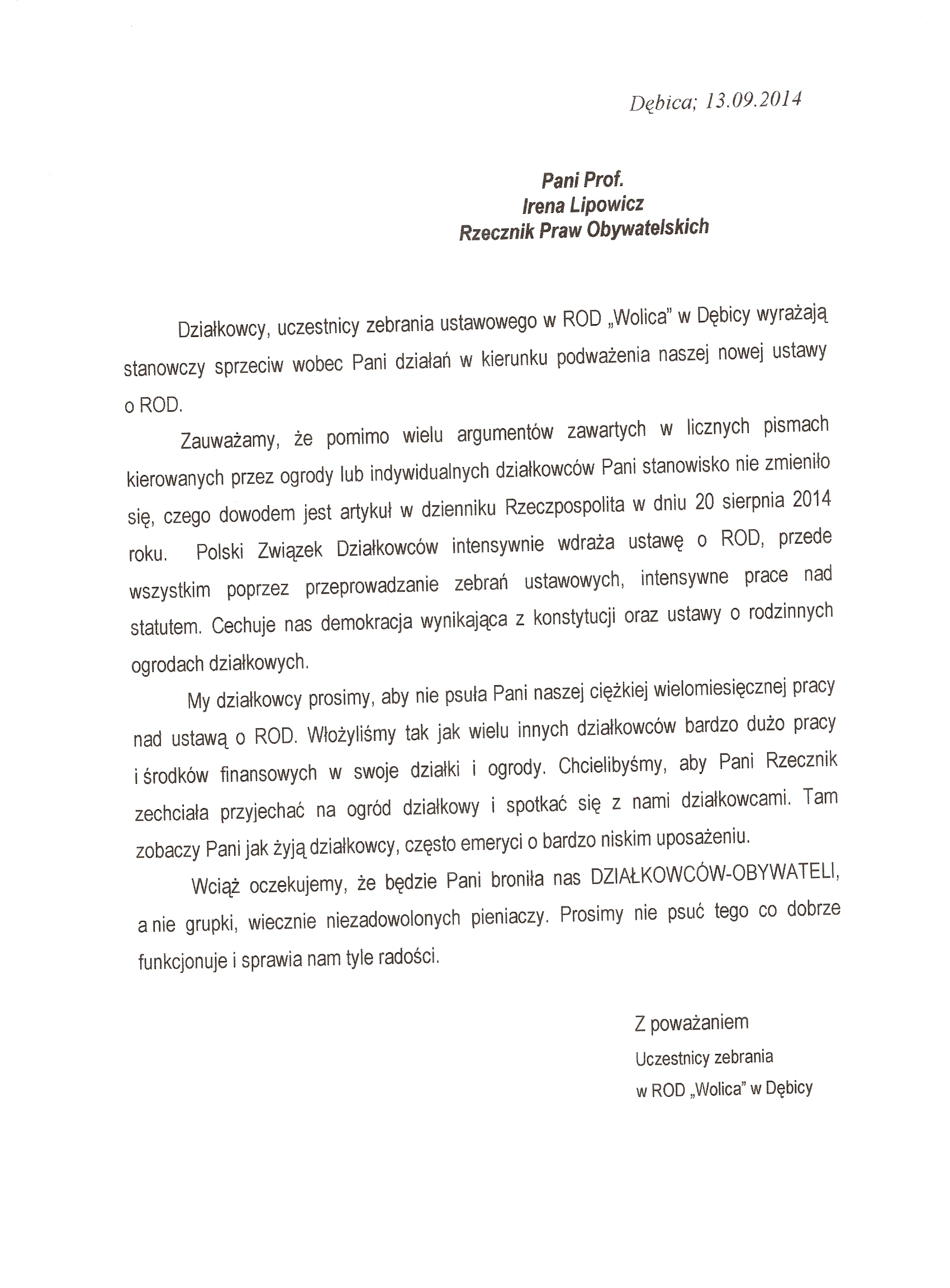 Działkowcy z ROD "Wolica" w Dębicy piszą do Rzecznika Praw Obywatelskich