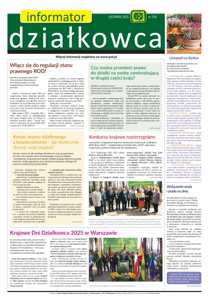 W najnowszym Informatorze „działkowca” m.in. o: Krajowych Dniach Działkowca 2025, rozstrzygnięciu konkursów krajowych, zabezpieczeniu działki na zimę, wyłączania prądu i wody na zimę, regulacji stanu prawnego gruntów ROD, możliwości nabycia działki przez osoby zamieszkujące w odległej części kraju oraz o zalecanych pracach ogrodniczych w listopadzie.