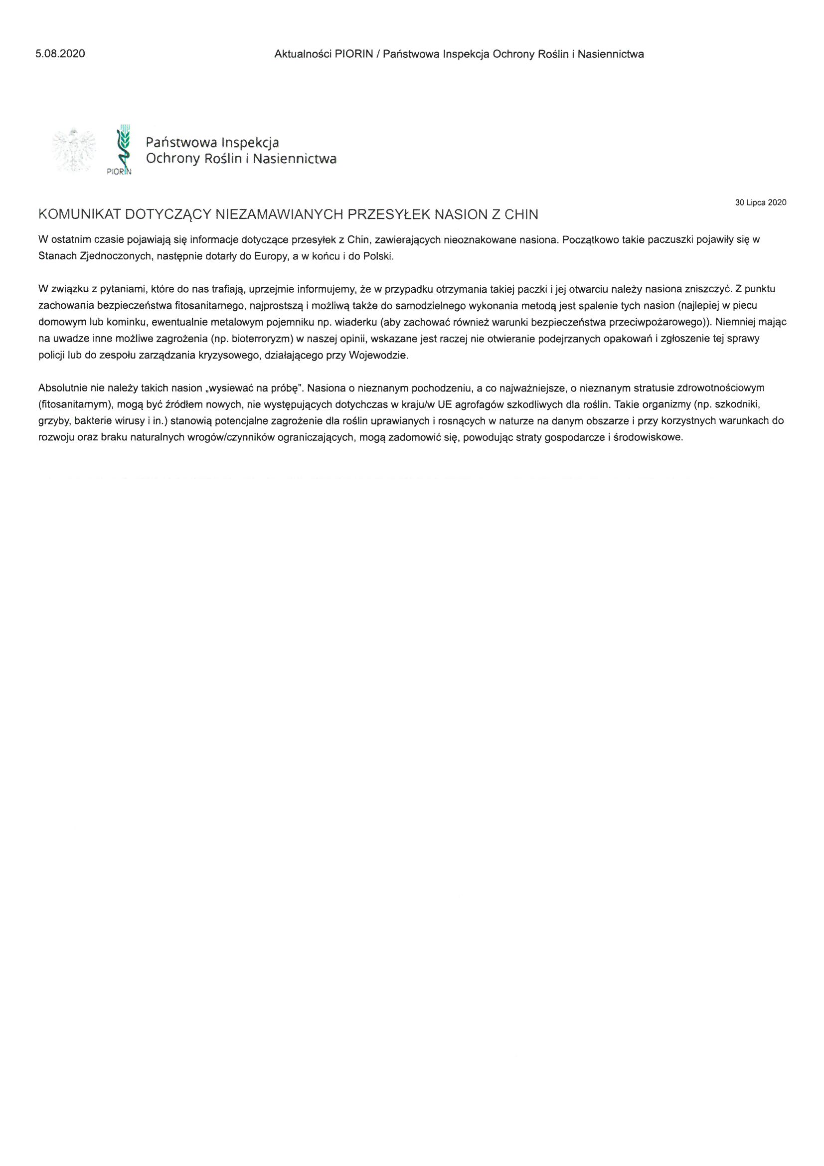 KOMUNIKAT DOTYCZĄCY NIEZAMAWIANYCH PRZESYŁEK NASION Z CHIN