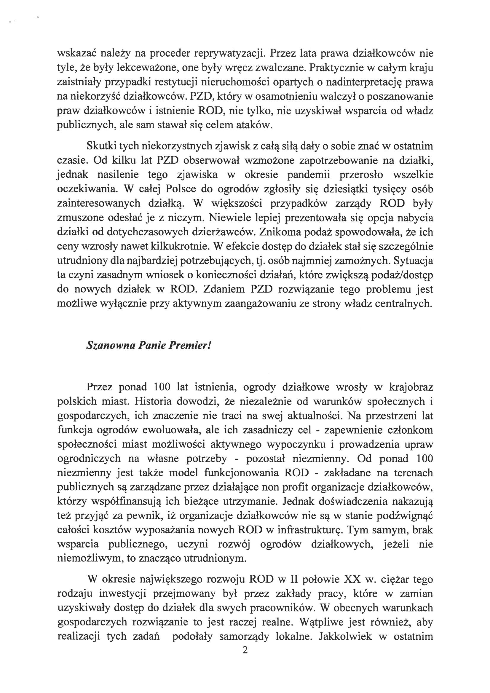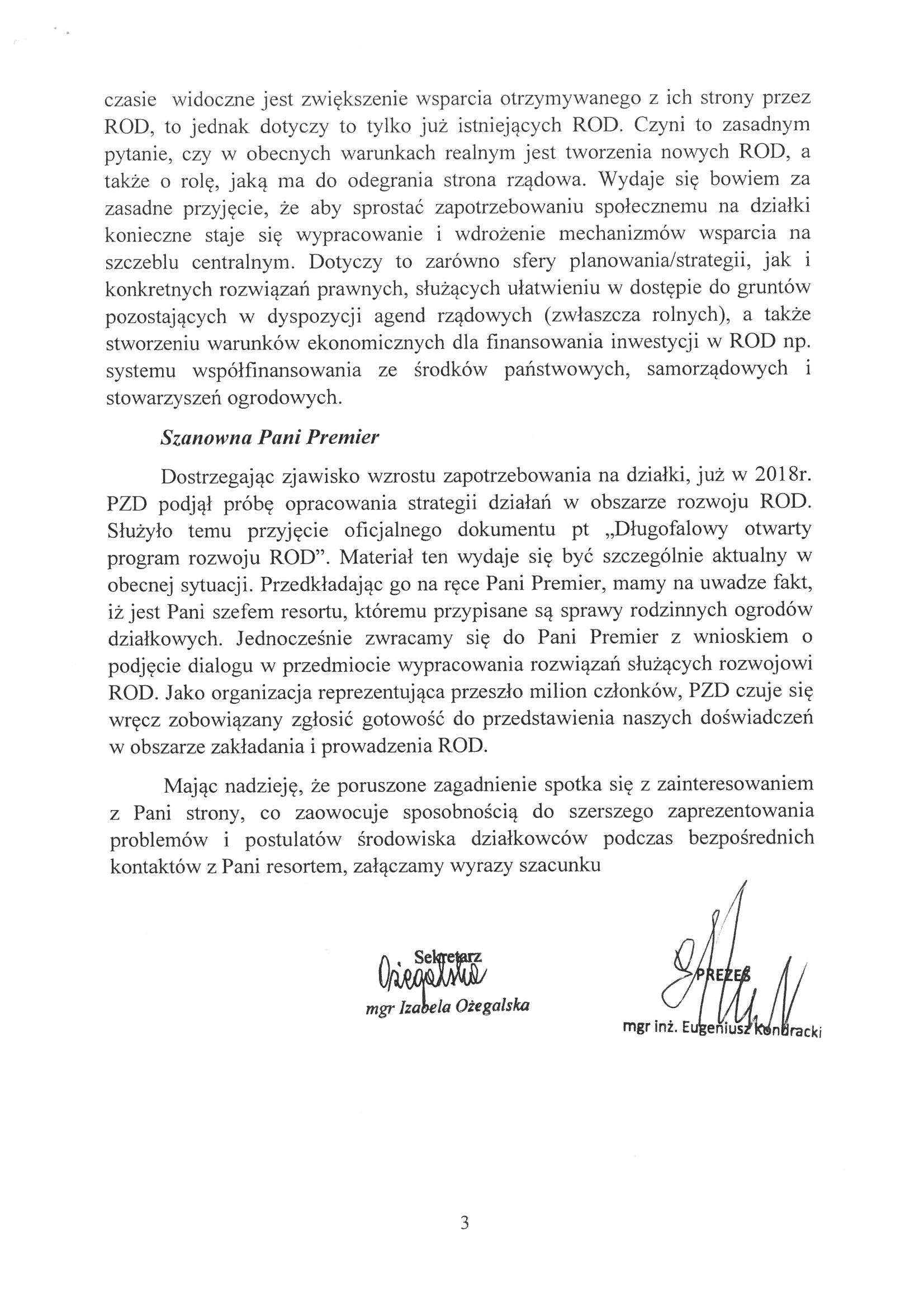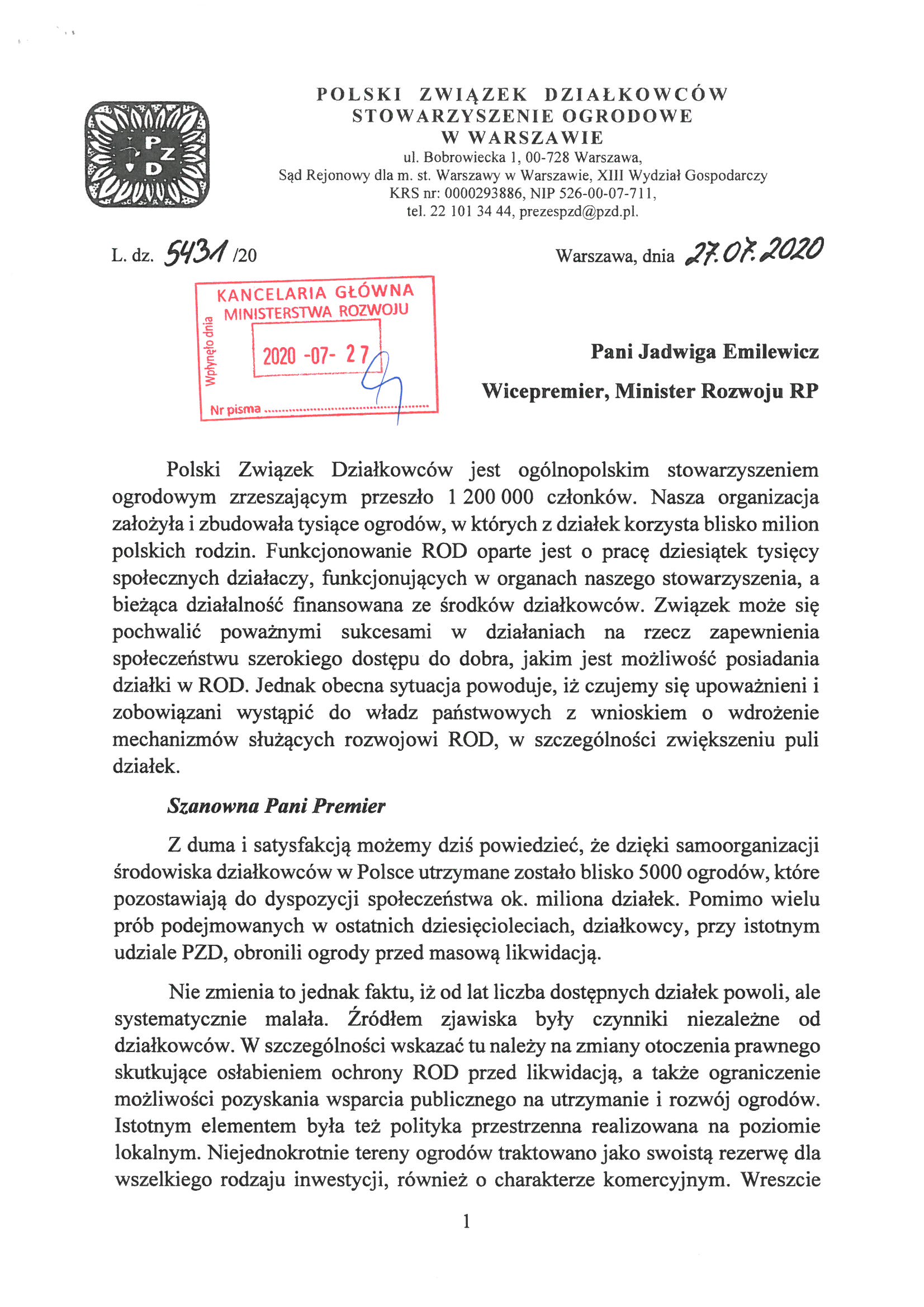 Na posiedzeniu Krajowej Rady PZD w dniu 23 lipca br., na którym omawiany był temat rosnącego zapotrzebowania na działki w ROD, zostało przyjęte pismo do Pani Jadwigi Emilewicz – Wicepremiera RP. W piśmie został przedstawiony dorobek Polskiego Związku Działkowców w zakresie budowy ogrodów działkowych, z których korzysta blisko milion polskich rodzin. Jednocześnie, KR PZD zwróciła się o podjęcie dialogu w przedmiocie wypracowania rozwiązań służących rozwojowi ROD.