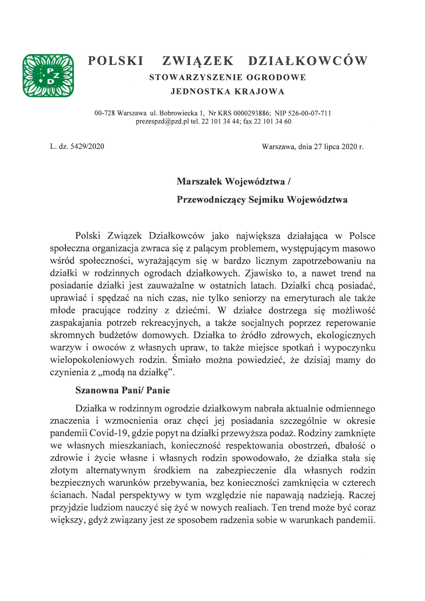 Krajowa Rada PZD pisze do Marszałków Województw i Przewodniczących Sejmików Wojewódzkich w sprawie rozwoju ROD