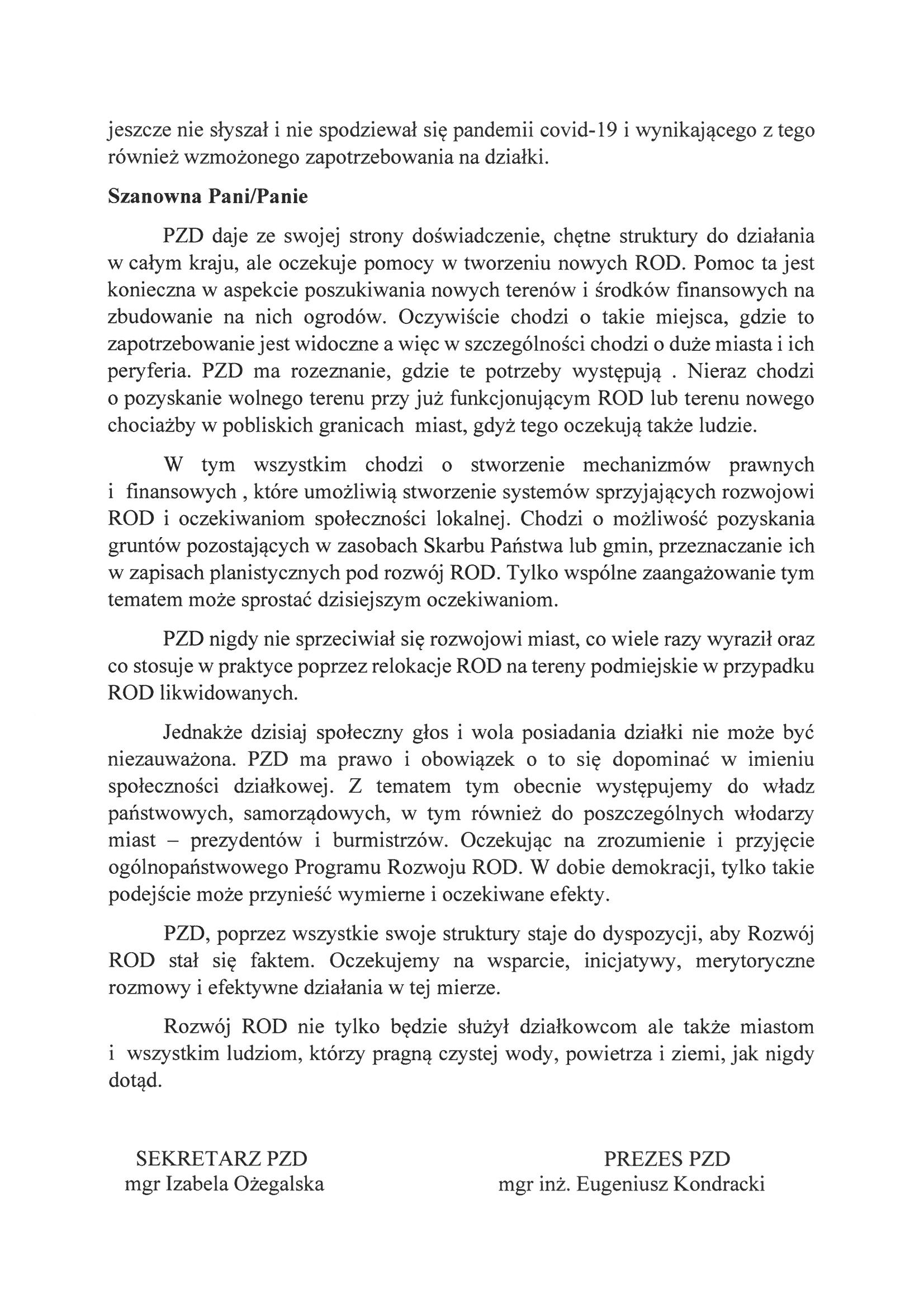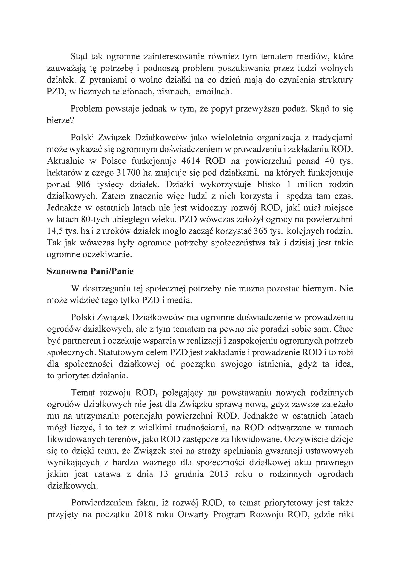 W dniu 23 lipca br., Krajowa Rada PZD przyjęła pismo, które zostało skierowane do wszystkich 16 Marszałków Województw i 16 Przewodniczących Sejmików Wojewódzkich w sprawie rozwoju ROD. W piśmie przedstawiona została kwestia rosnącego zapotrzebowania na działki w ROD, które dostrzegalne jest w szczególności w ostatnich miesiącach. Potwierdzają to liczne maile