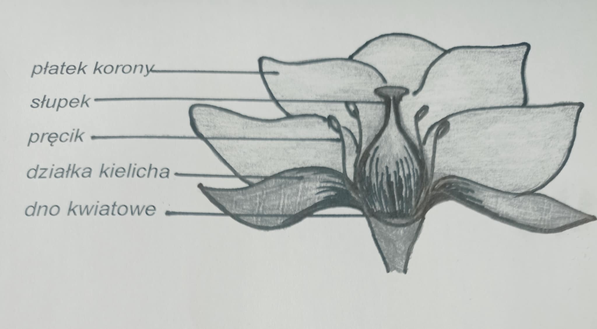 Działka kielicha, to element dolnej (zewnętrznej) części okwiatu zróżnicowanego na kielich i koronę. Płatki korony, to elementy tworzące wewnętrzną część okółka – okwiat. Pręcik, to element kwiatu wytwarzający pyłek - męski organ rozmnażania płciowego roślin nasiennych. Słupek, to element kwiatu, na którego szczycie znajduje się znamię, będące miejscem przyjmowania i kiełkowania pyłku. W dolnej części jest zalążnia, w której rozwija się żeński organ rozmnażania płciowego roślin nasiennych.