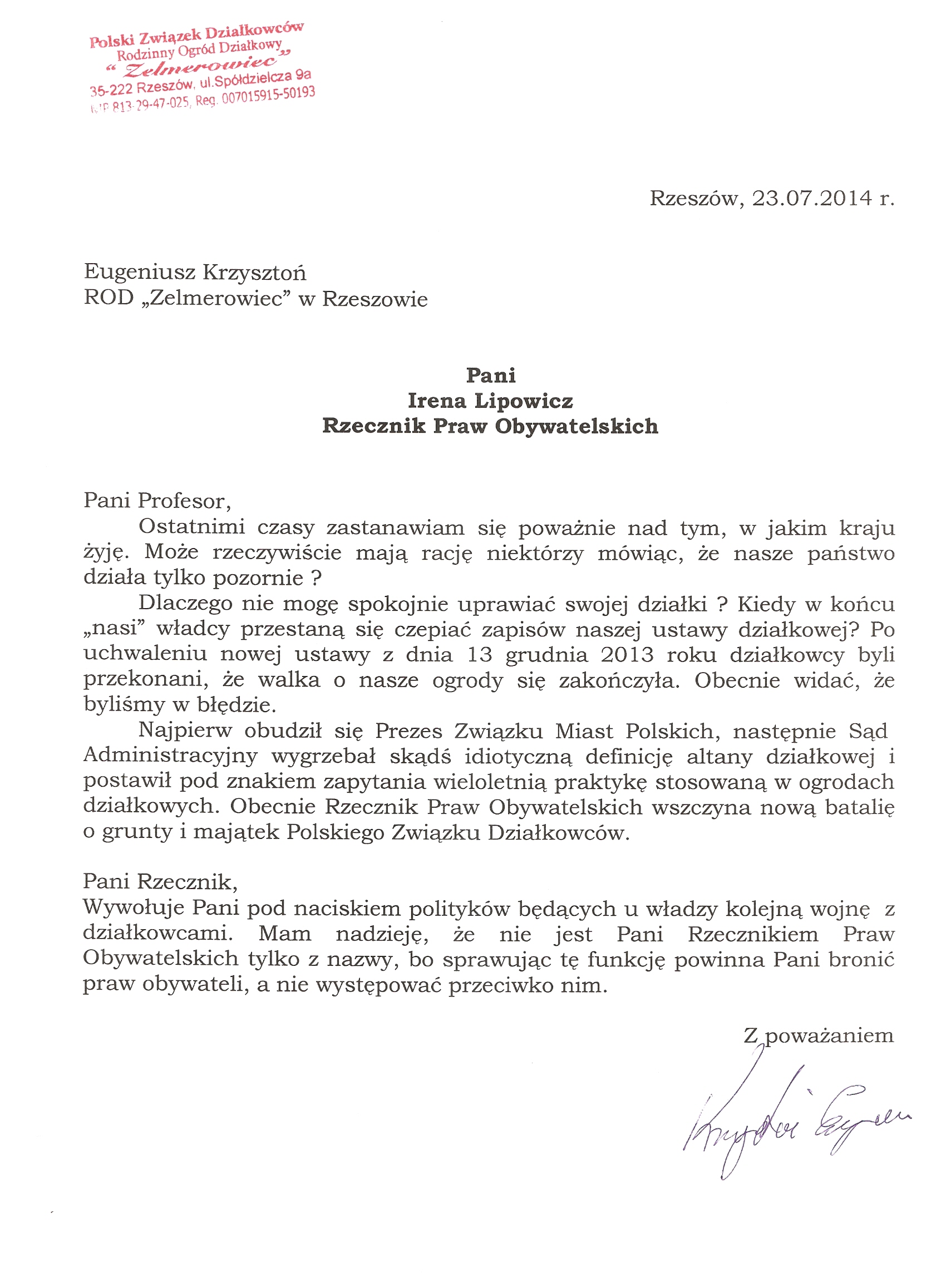 List Pana Eugeniusza Krzysztonia Prezesa ROD "Zelmerowiec" w Rzeszowie do Rzecznika Praw Obywatelskich