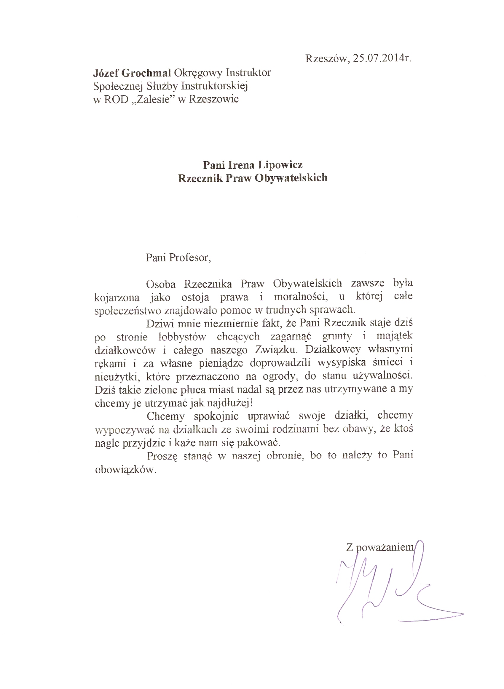 List Pana Józefa Grochmala Okręgowego Instruktora SSI do Rzecznika Praw Obywatelskich
