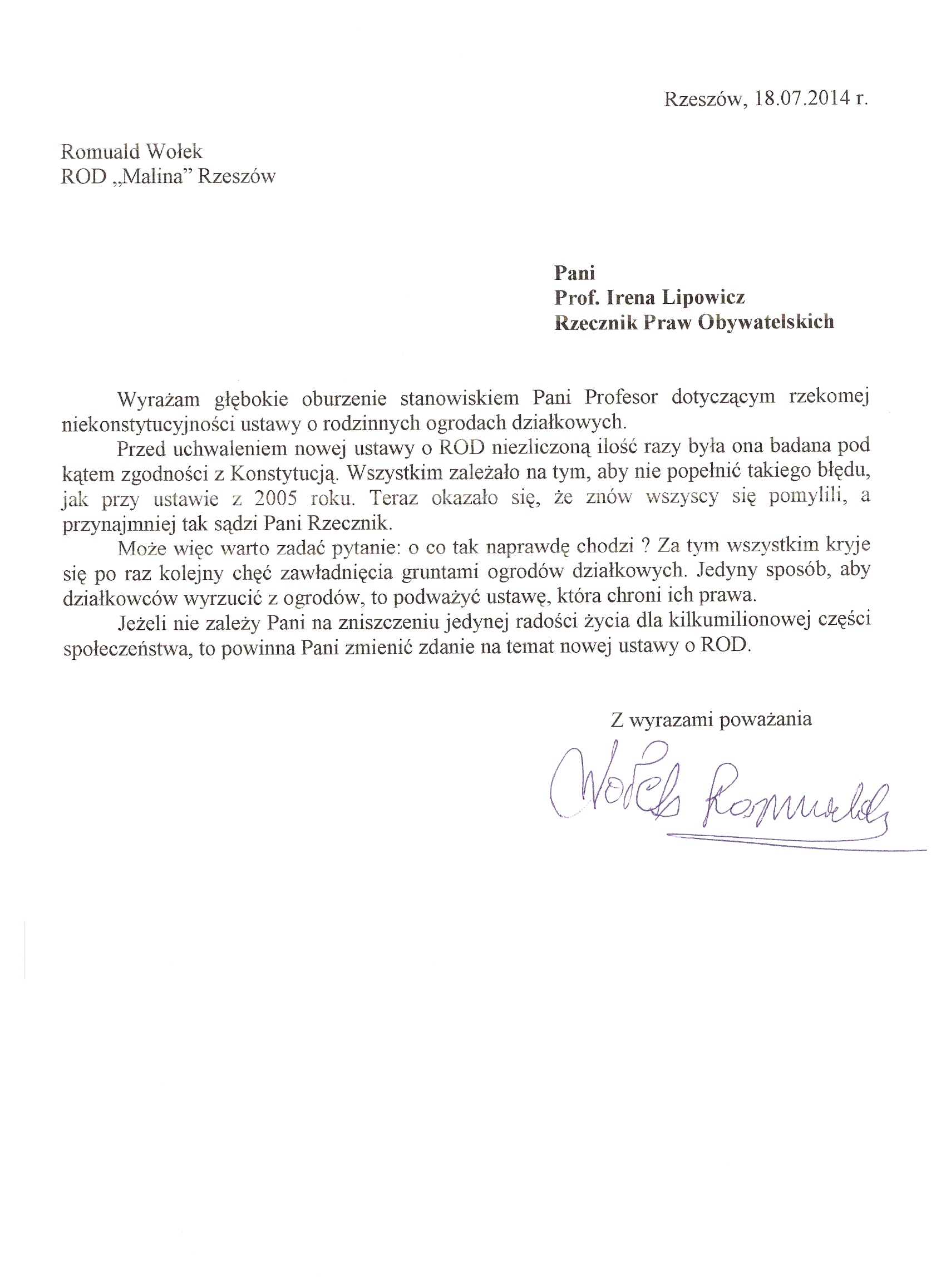 List Pana Romualda Wołka z ROD "Malina" w Rzeszowie do Rzecznika Praw Obywatelskich