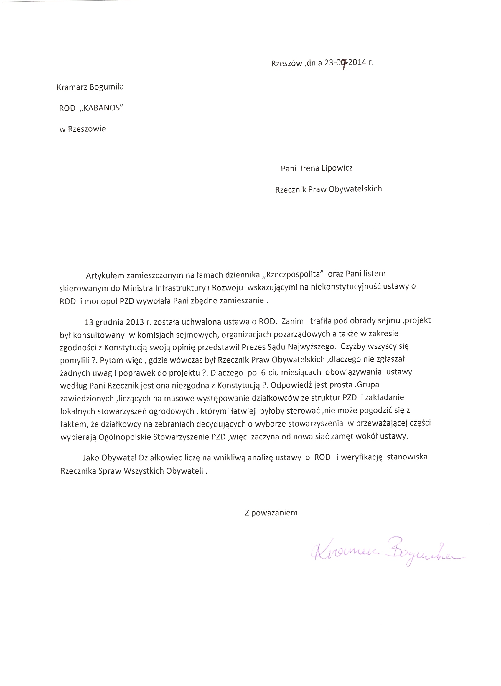 List Pani Bogumiły Kramarz z ROD "Kabanos" w Rzeszowie do RZecznika Praw Obywatelskich
