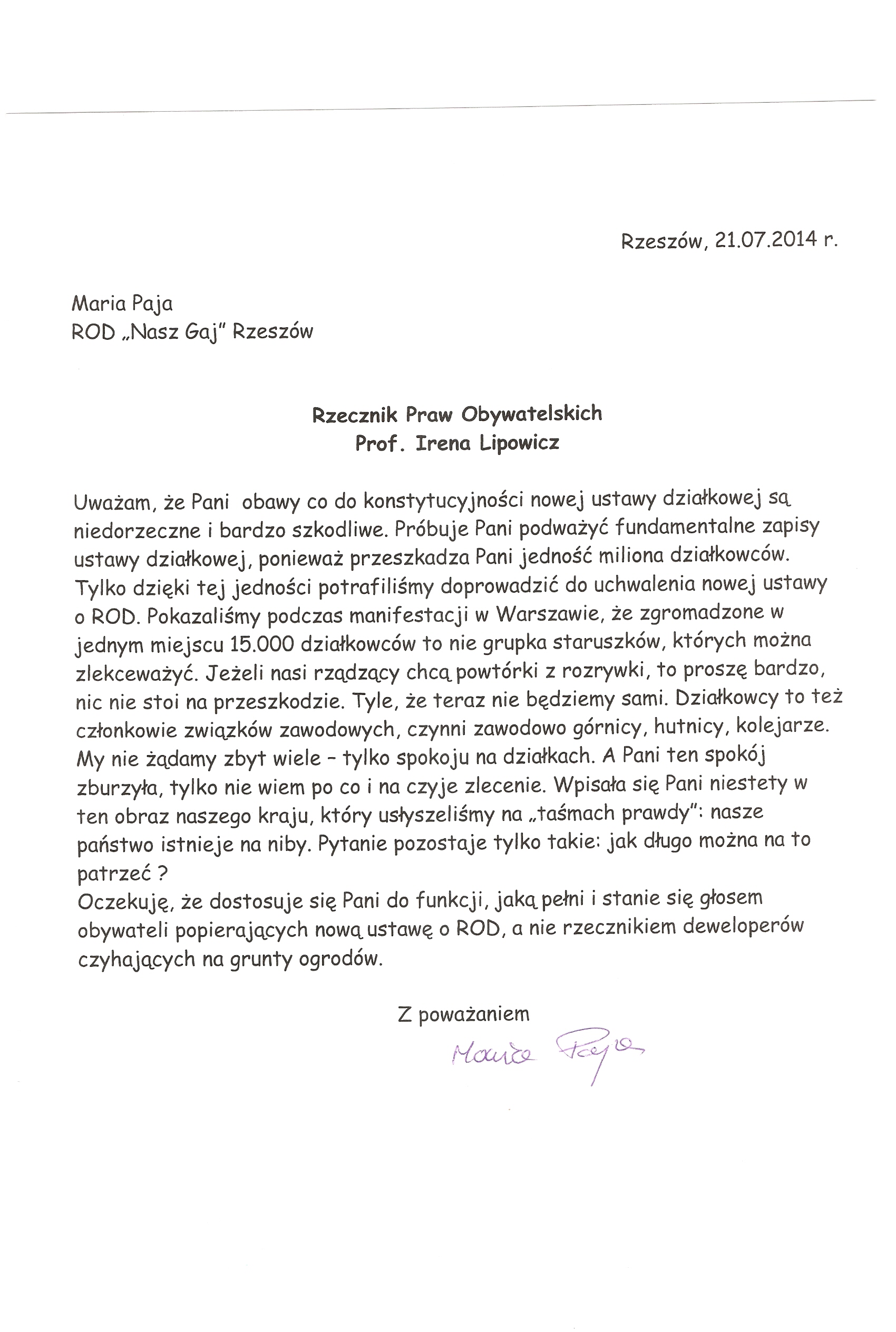 List Pani Marii Paja Prezesa ROD "Nasz Gaj" w Rzeszowie do Rzecznika Praw Obywatelskich