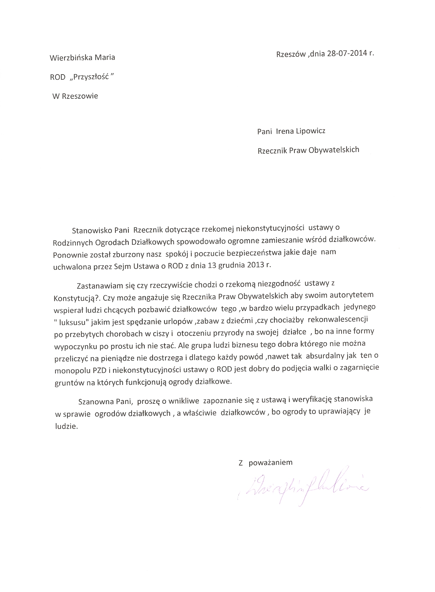 List Pani Marii Wierzbińskiej do Rzecznika Praw Obywatelskich