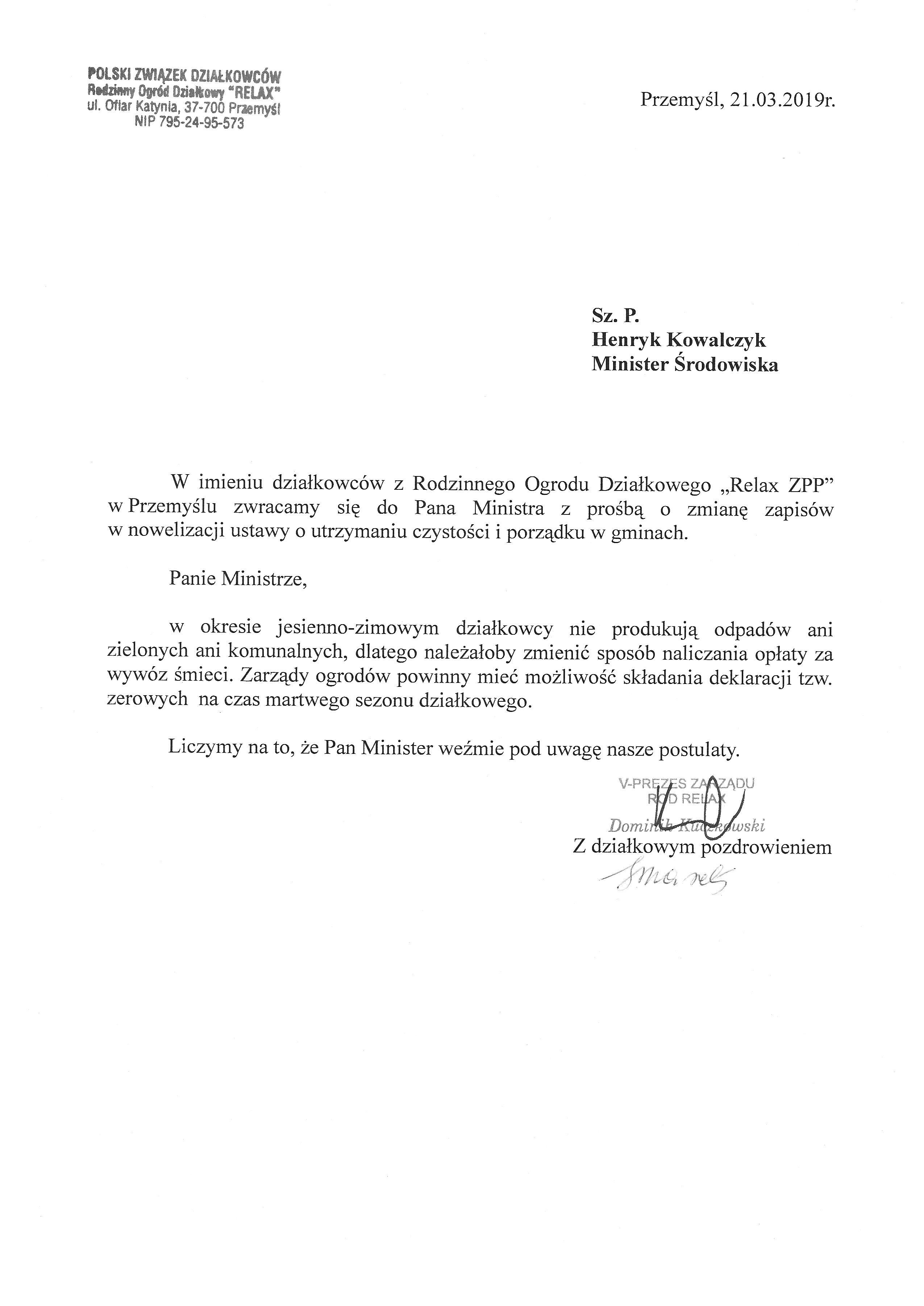 List z ROD Relax ZPP w Przemyślu do Ministra Środowiska