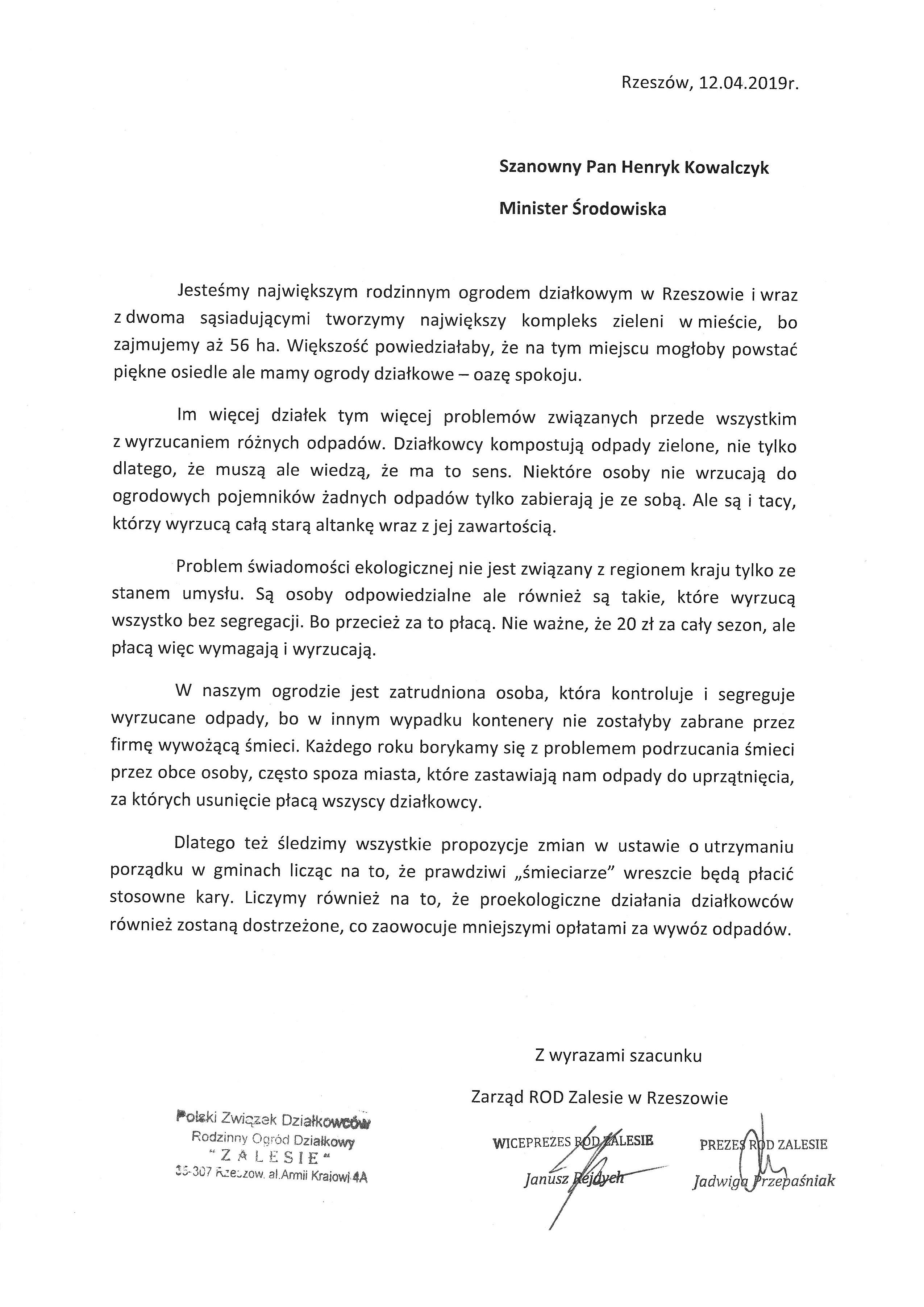 List Zarządu ROD "Zalesie" w Rzeszowie do Ministra Środowiska