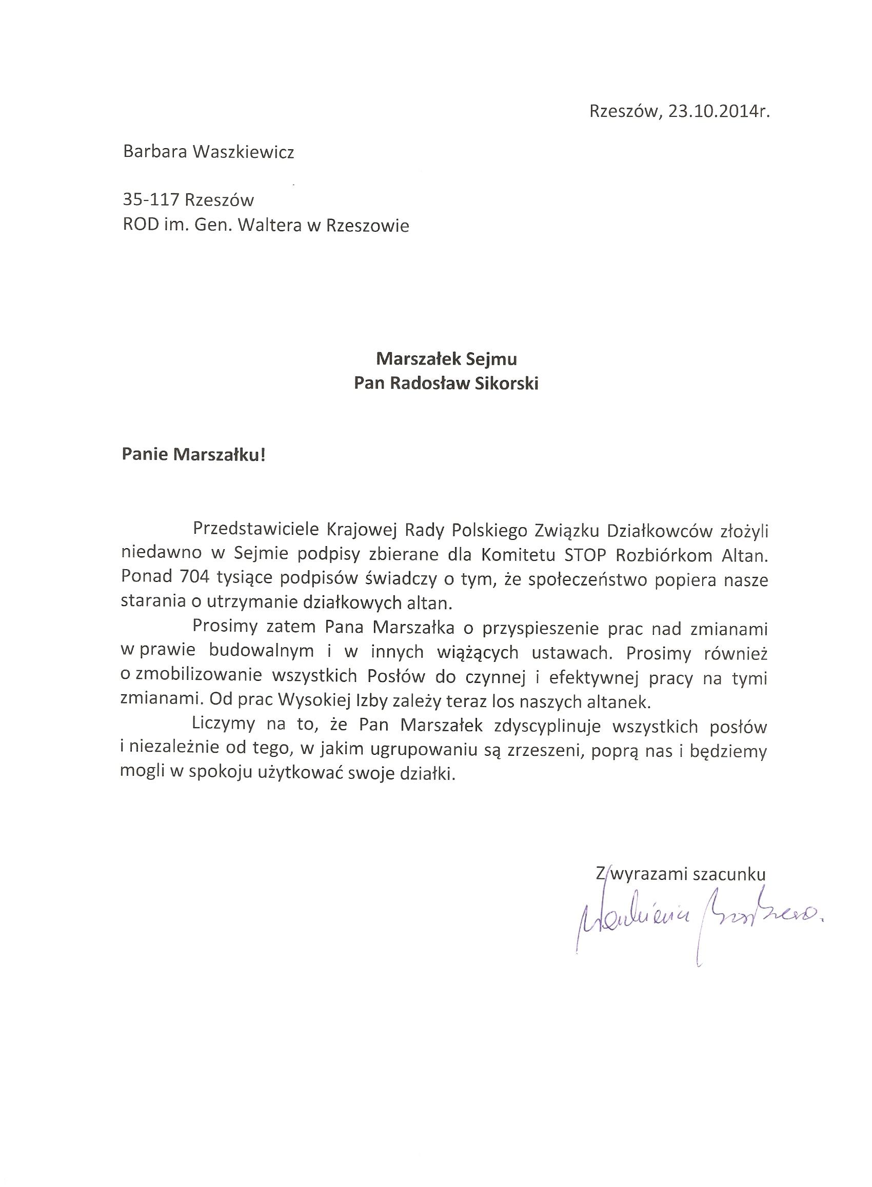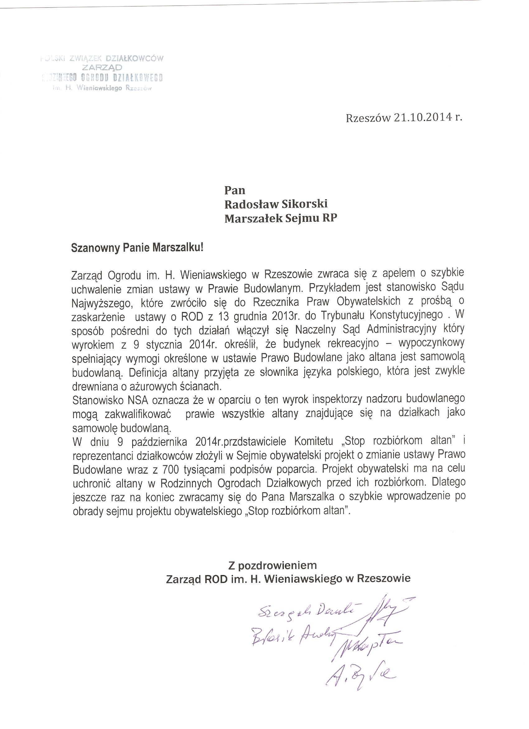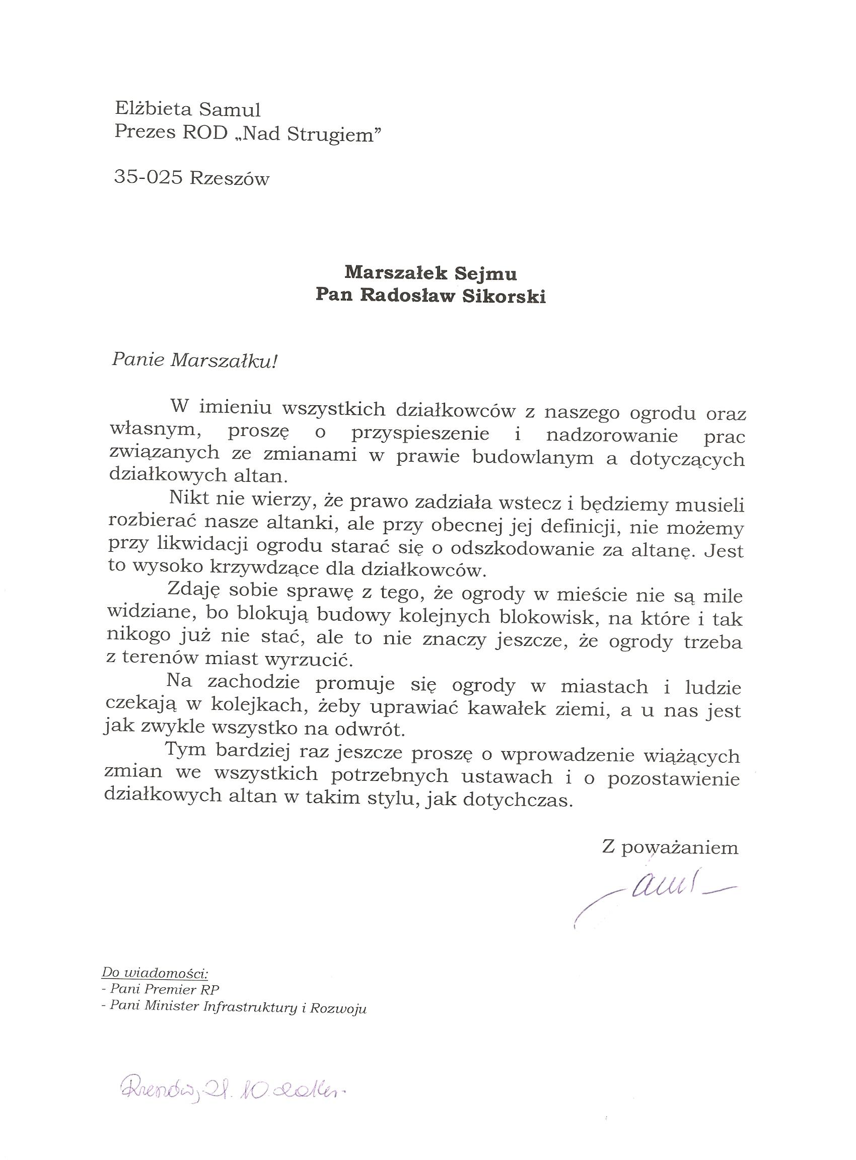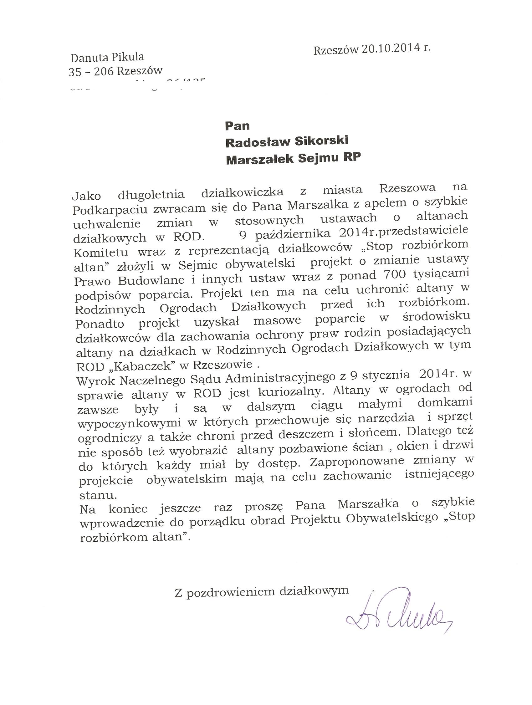 "Wyrok Naczelnego Sądu Administracyjnego z 9 stycznia 2014 roku w sprawie altany w ROD jest kuriozalny" - pisze do Marszałka Sejmu RP Danuta Pikula z Rodzinnego Ogrodu Działkowego "Kabaczek" w Rzeszowie.