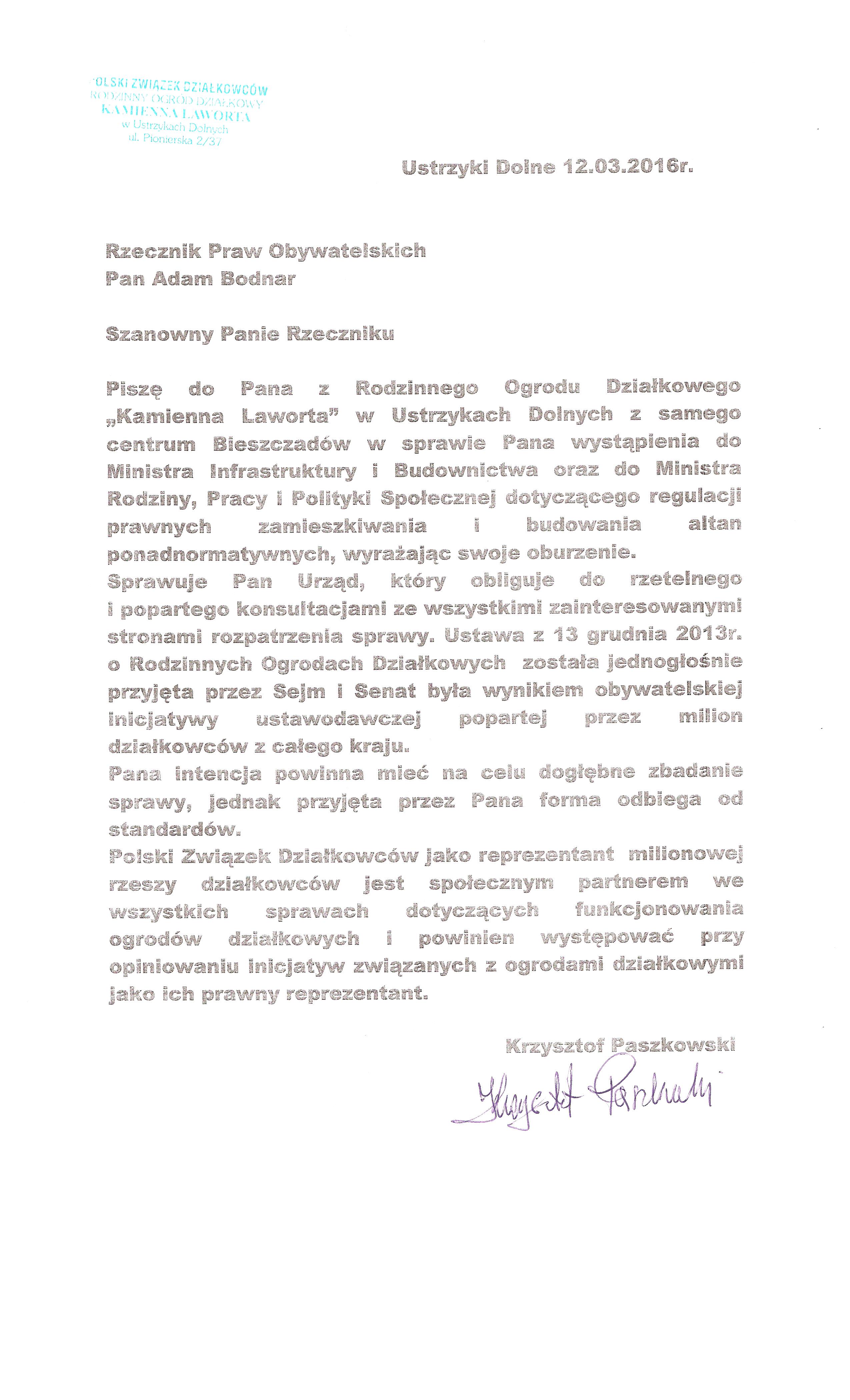 Listy i Stanowiska działkowców w sprawie wystąpienia Rzecznika Praw Obywatelskich