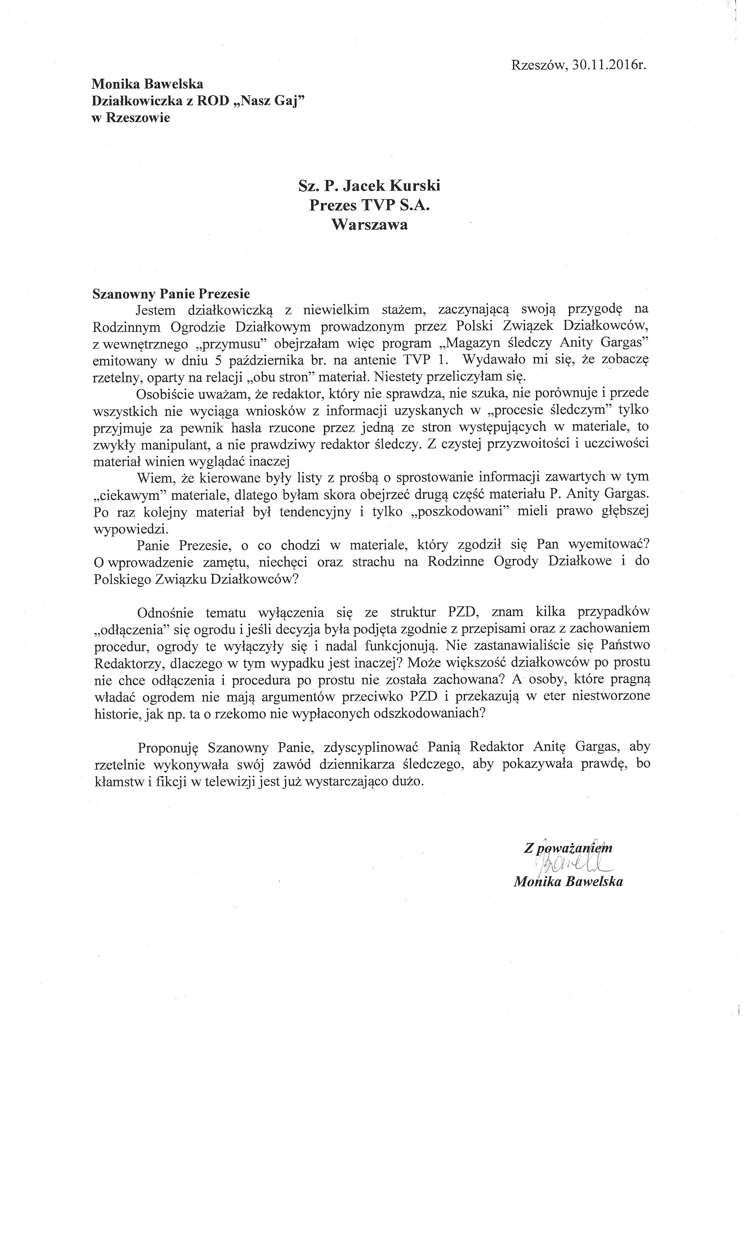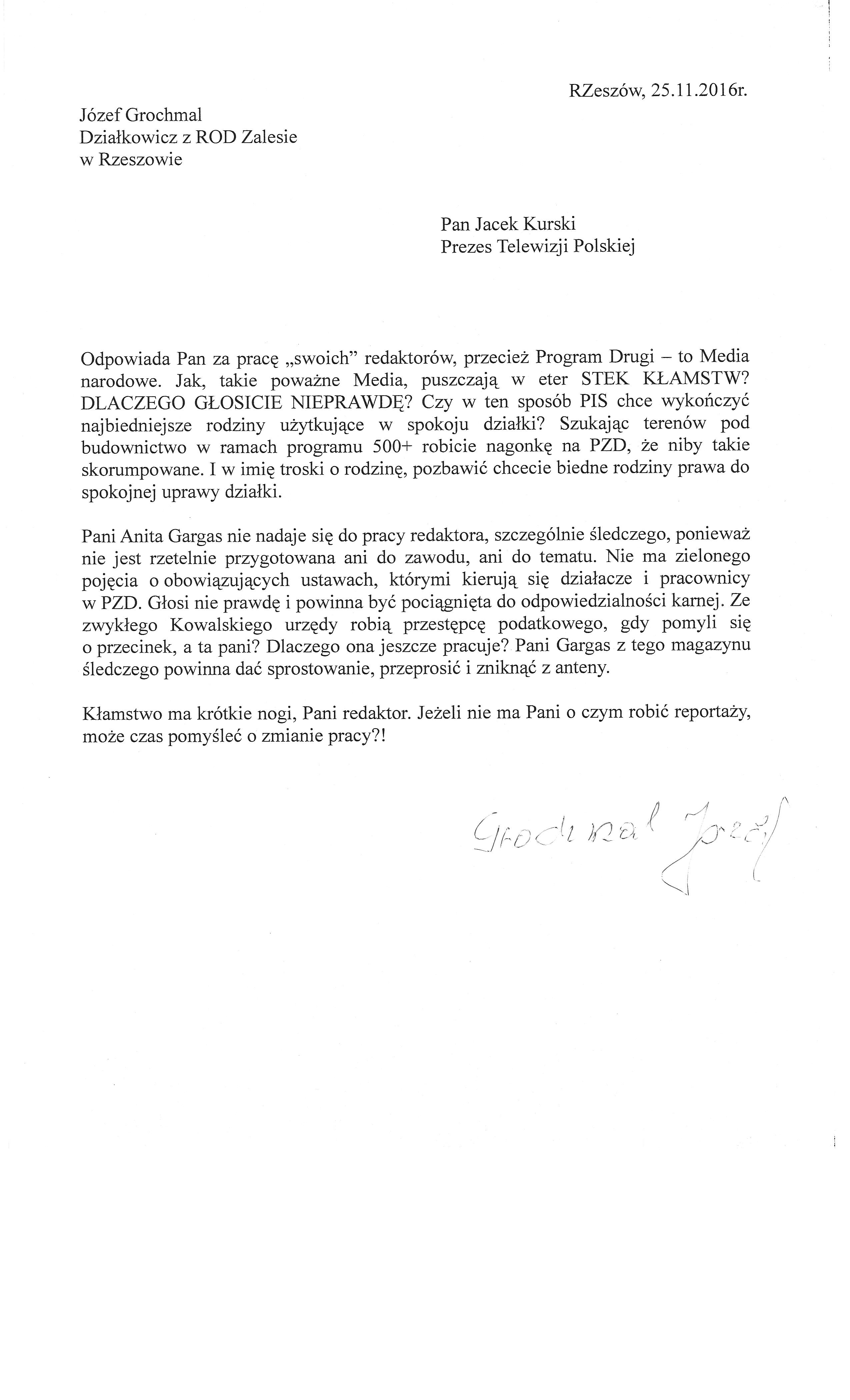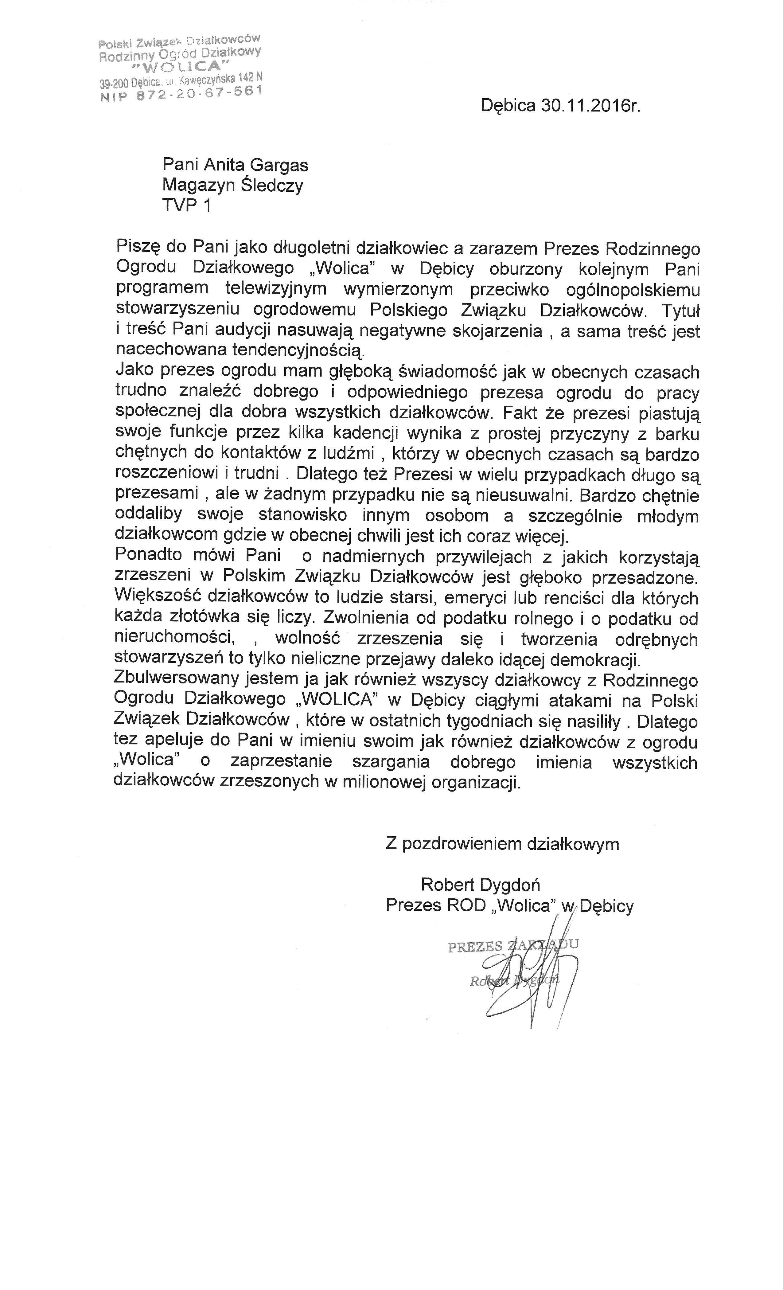 Emisja na antenie Programu 1 TVP dwóch reportaży w "Magazynie śledczym Anity Gargas" skłoniła mnie do złożenia na Pana ręce wniosku o natychmiastowe zdjęcie z ramówki programowej tego wątpliwej jakości dzieła. Dziennikarstwo śledcze, jakie widnieje w tytule tego magazynu, nie może polegać wyłącznie na szkalowaniu Polskiego Związku Działkowców. Pytam Pana Prezesa: kto dał Anicie Gargas prawo do zajadłego i ślepego krytykowania jednej z największych organizacji społecznych w Polsce? (...) - napisała pani Elzibieta Jakóbiec - działkowiczka z ROD "Wieniawskiego" w Rzeszowie