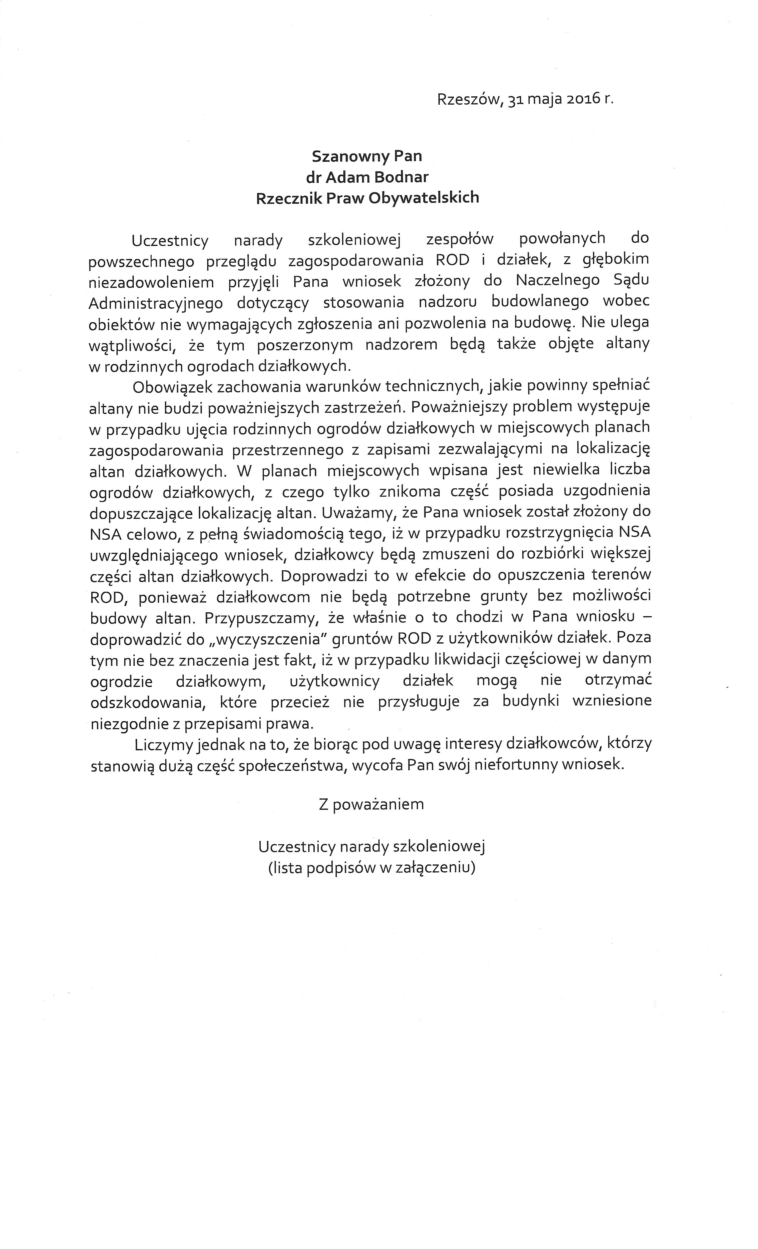 Pierwszym punktem narady było omówienie wniosku Rzecznika Praw Obywatelskich skierowanego do Naczelnego Sądu Administracyjnego o rozstrzygnięcie zagadnienia prawnego dotyczącego możliwości stosowania przez organy budowlane rozszerzonego nadzoru w stosunku do obiektów budowlanych, niewymagających zgłoszenia, ani pozwolenia na budowę, czyli również altan działkowych. Prezes OZP poinformowała uczestników szkolenia, że szczególne zagrożenie dotyczy tych ogrodów działkowych, które nie są ujęte w miejscowych planach zagospodarowania przestrzennego, a także tych, które co prawda są umieszczone w planach, ale ich ustalenia szczegółowe nie zezwalają na lokalizację altan działkowych. Pan dr Damian Makowski podkreślił, że stanowisko Krajowej Rady jest w tej sprawie jednoznaczne i przeciwstawia się inicjatywie Rzecznika Praw Obywatelskich. Krajowa Rada PZD złożyła pismo do Rzecznika w sprawie wycofania wniosku do Naczelnego Sądu Administracyjnego dotyczącego altan w rodzinnych ogrodach działkowych. Efektem krótkiej dyskusji w tym temacie było przyjęcie przez uczestników narady szkoleniowej listu do RPO w sprawie wycofania wniosku.