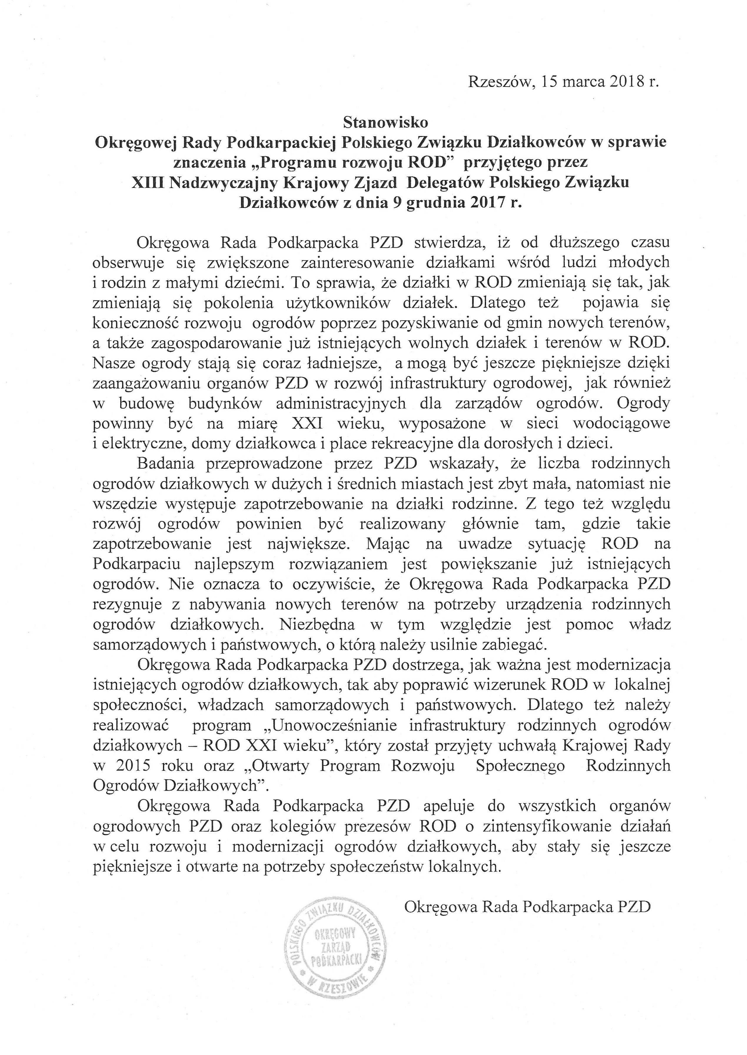 Treść Stanowiska Okręgowej Rady Podkarpackiej PZD