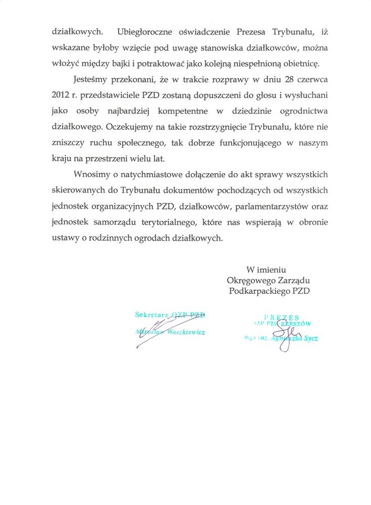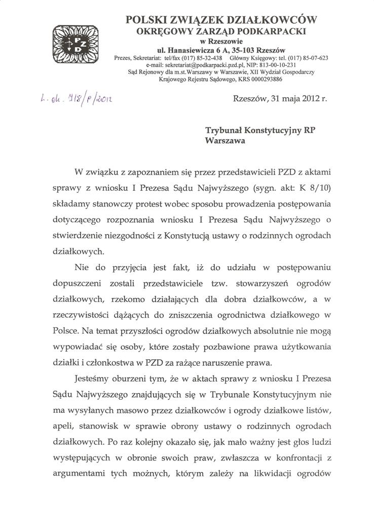 W związku z wyznaczonym terminem rozprawy przed Trybunałem Konstytucyjnym w sprawie z wniosku I Prezesa Sądu Najwyższego o stwierdzenie niezgodności Ustawy o ROD z Konstytucją, Okręgowy Zarząd Podkarpacki PZD po raz kolejny zwraca się do Sędziów Trybunału o wysłuchanie racji najbardziej zainteresowanych - działkowców.