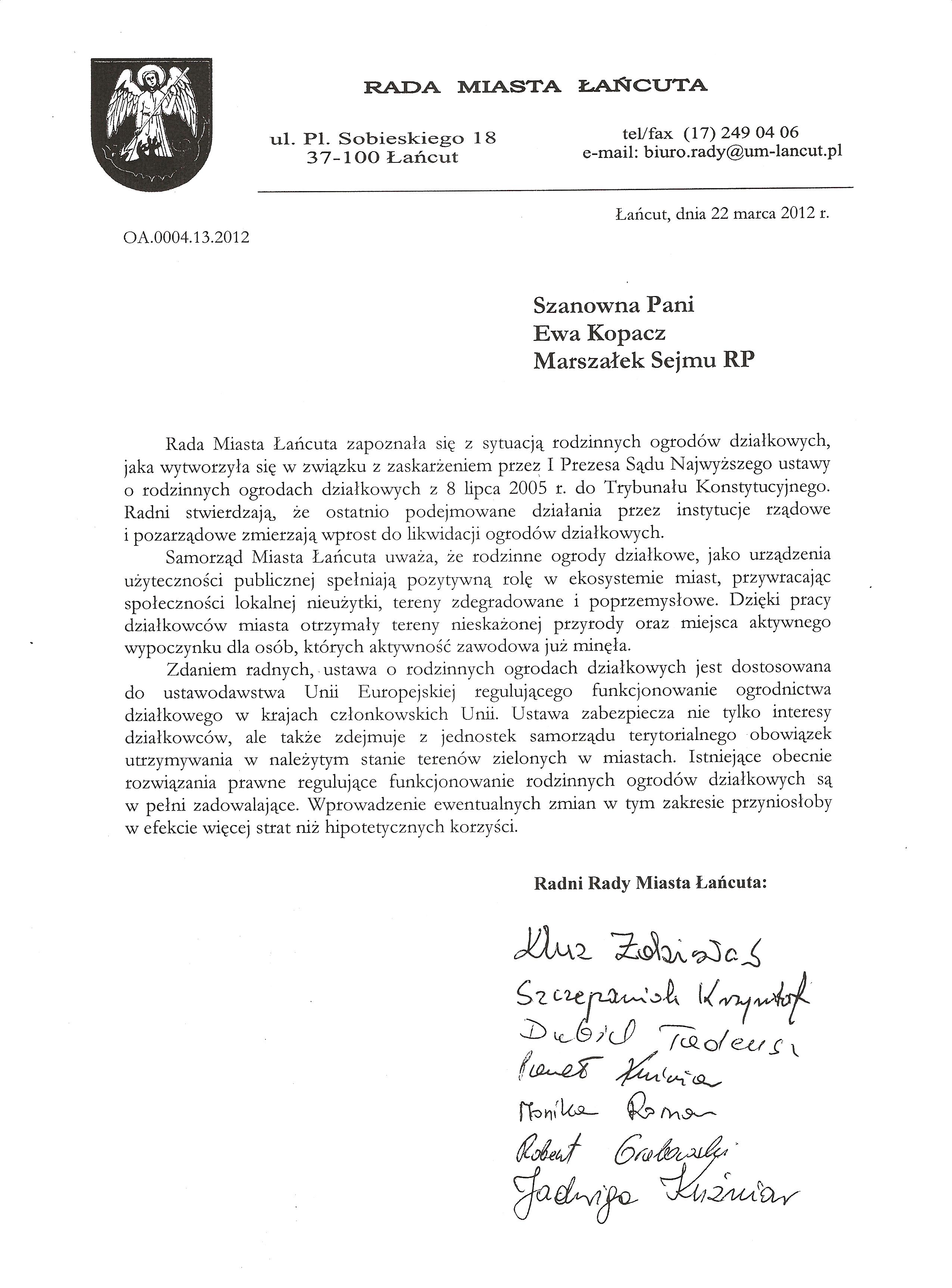 W liście skierowanym do Marszałek Sejmu RP Burmistrz Miasta Łańcuta pisze "Gmina Miasto Łańcut akceptuje i w pełni popiera istniejące obecnie rozwiązania prawne regulujące funkcjonowanie ogrodów działkowych położonych na terenie naszego miasta"
