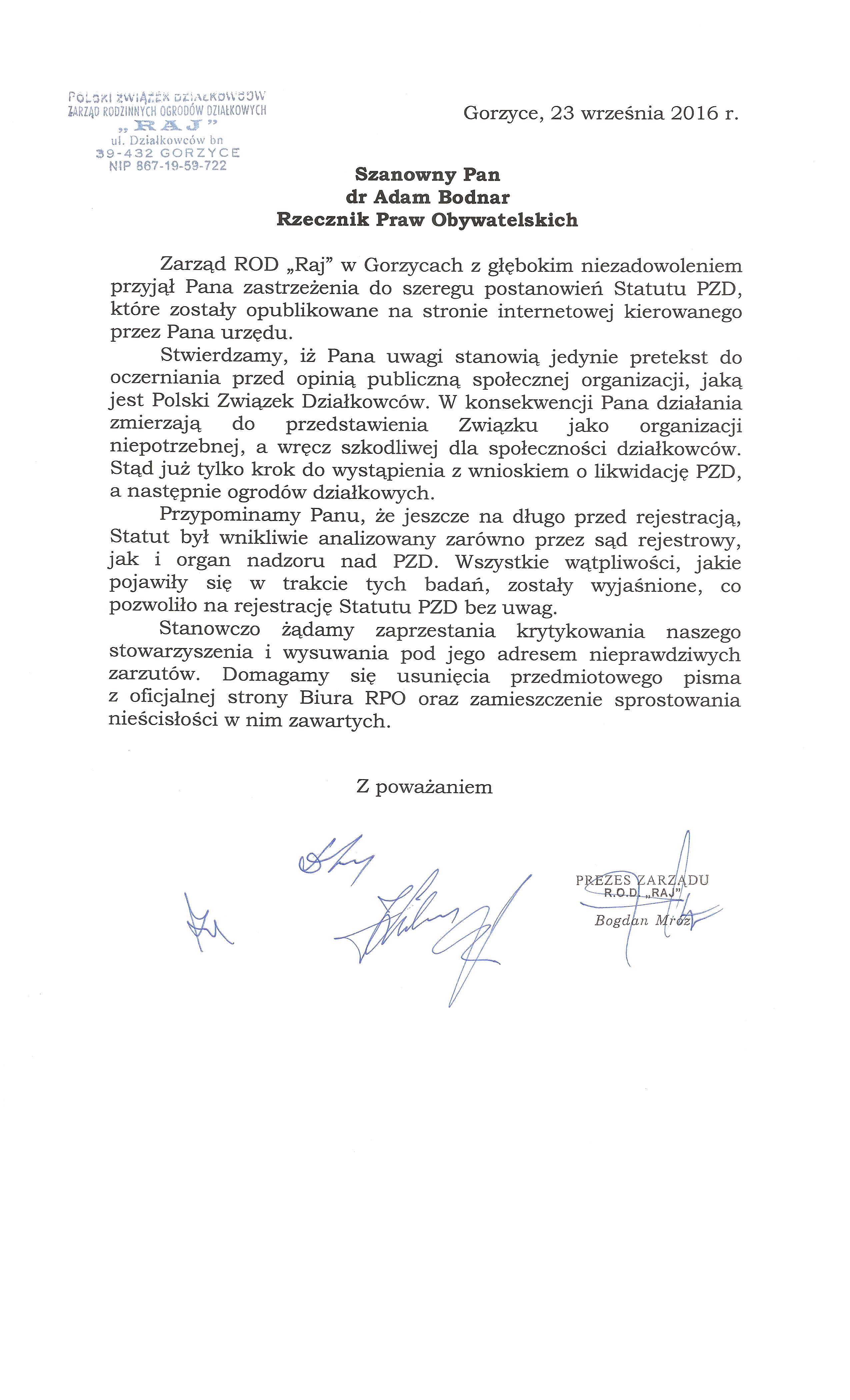 (...) Stwierdzamy, iż Pana uwagi stanowią jedynie pretekst do oczerniania przed opinią publiczną społecznej organizacji, jaką jest Polski Związek Działkowców (...) - piszą członkowie Zarządu ROD "Raj" w Gorzycach w liście skierowanym do Rzecznika Praw Obywatelskich