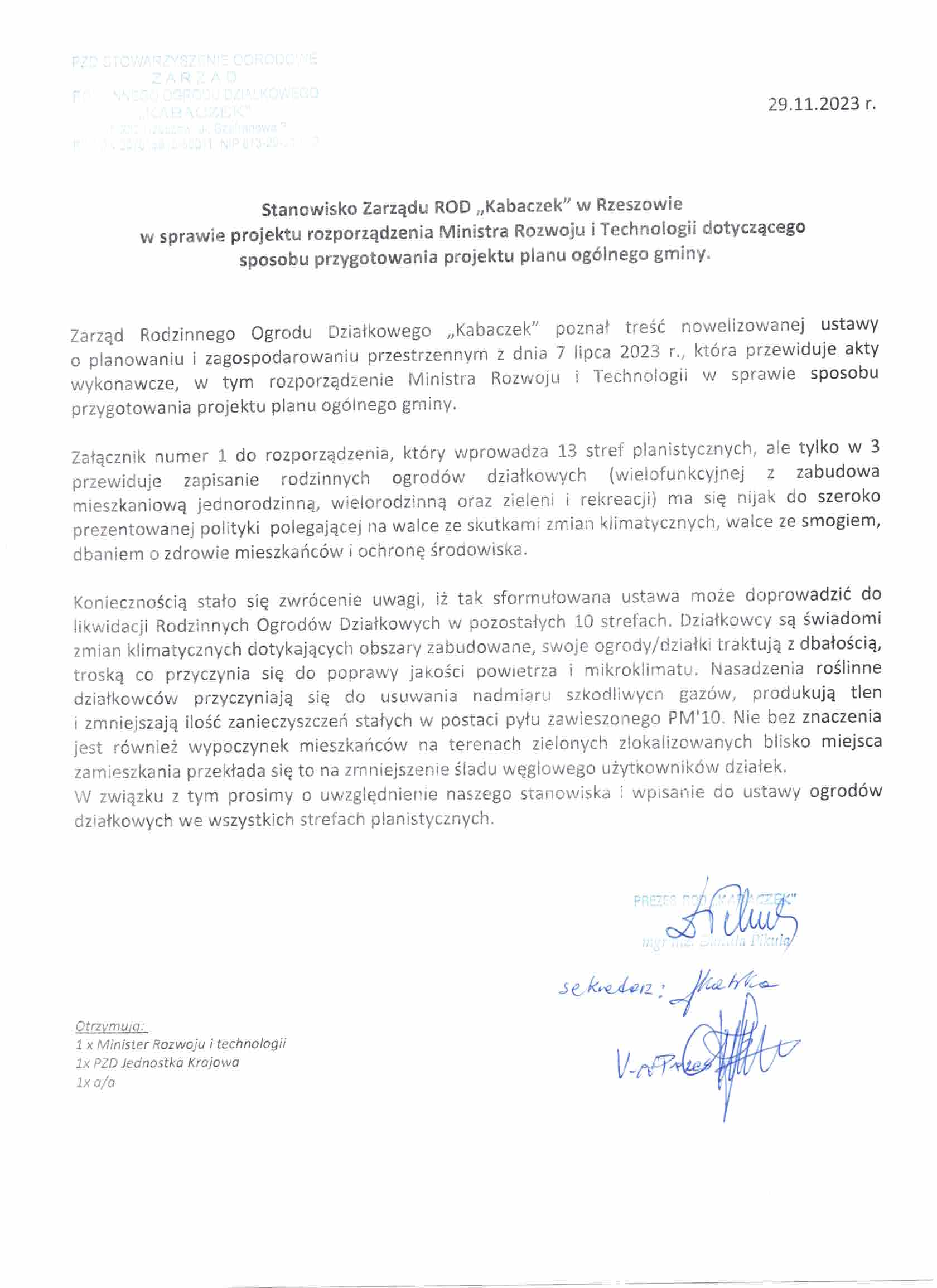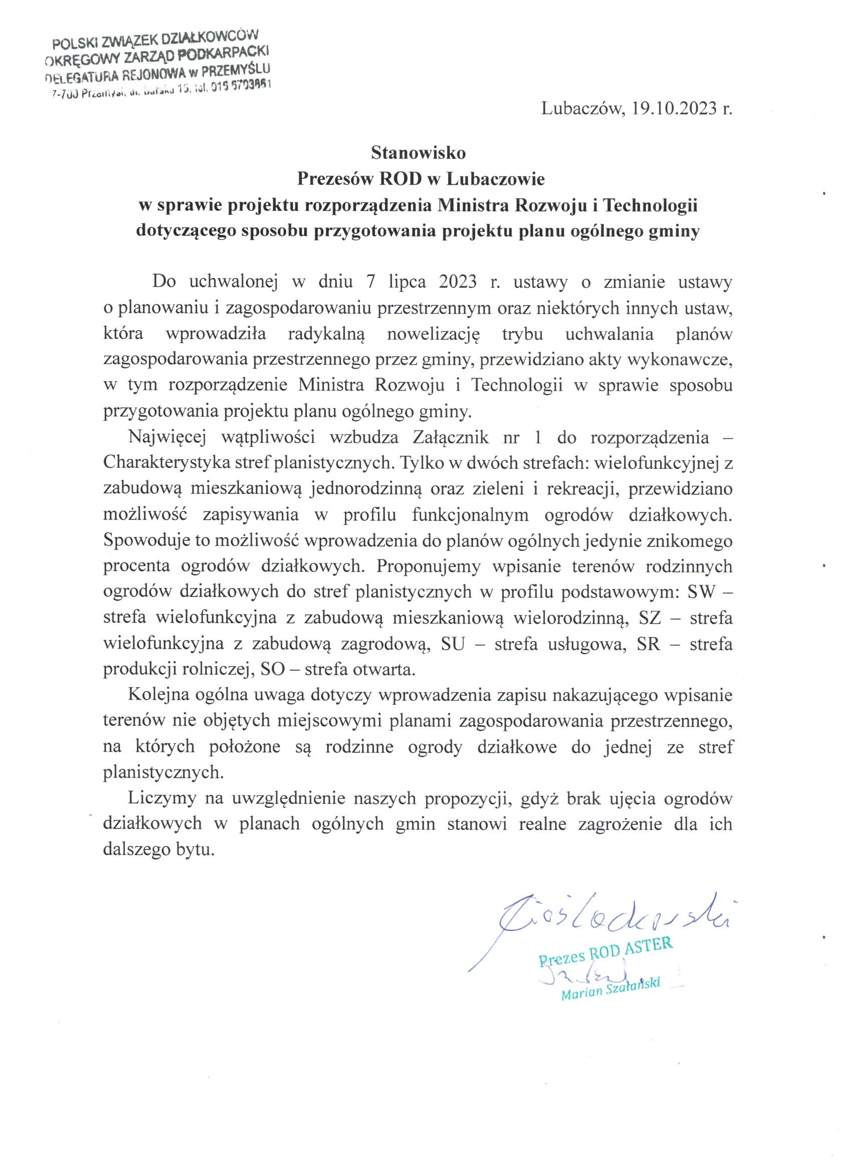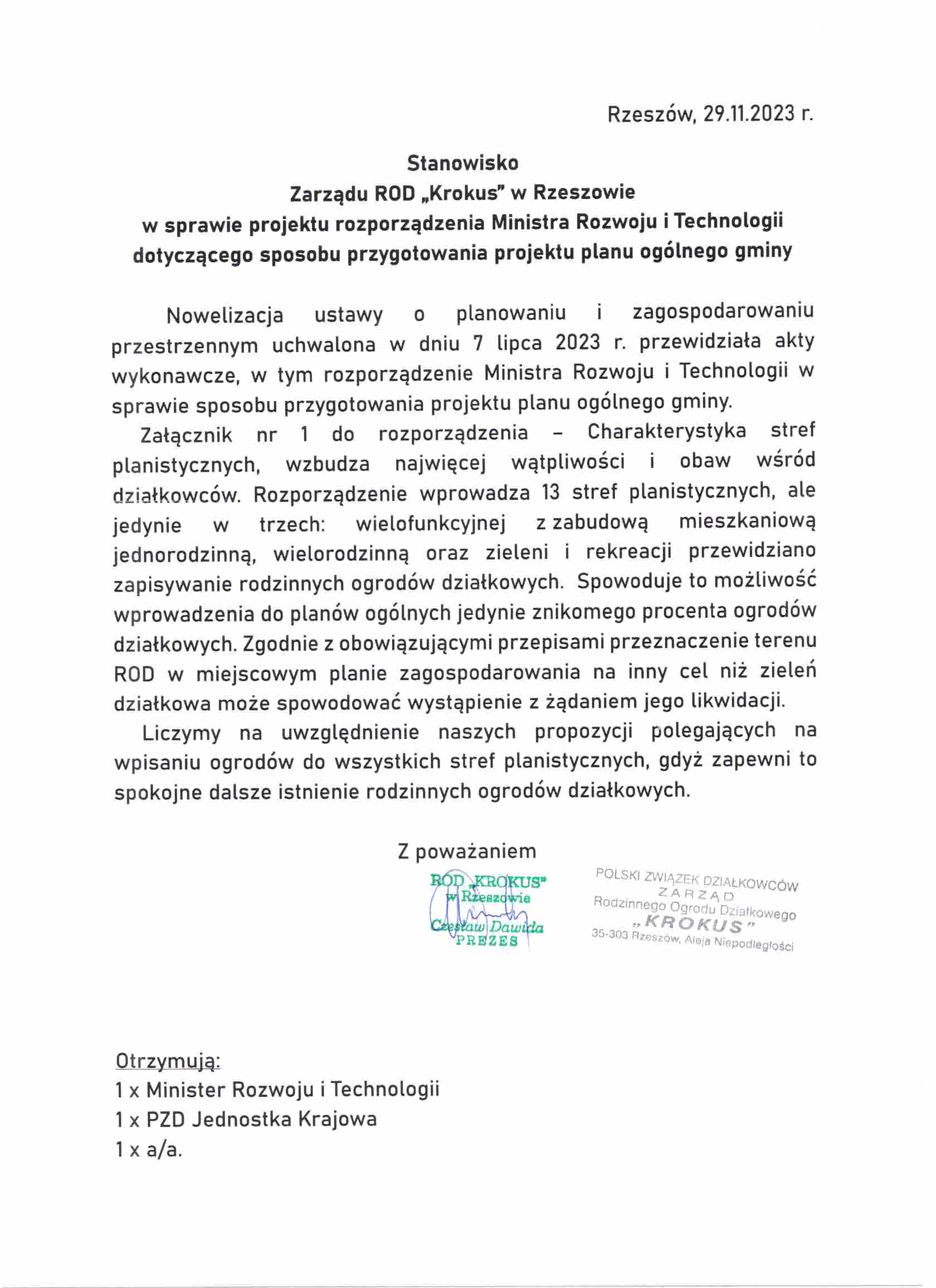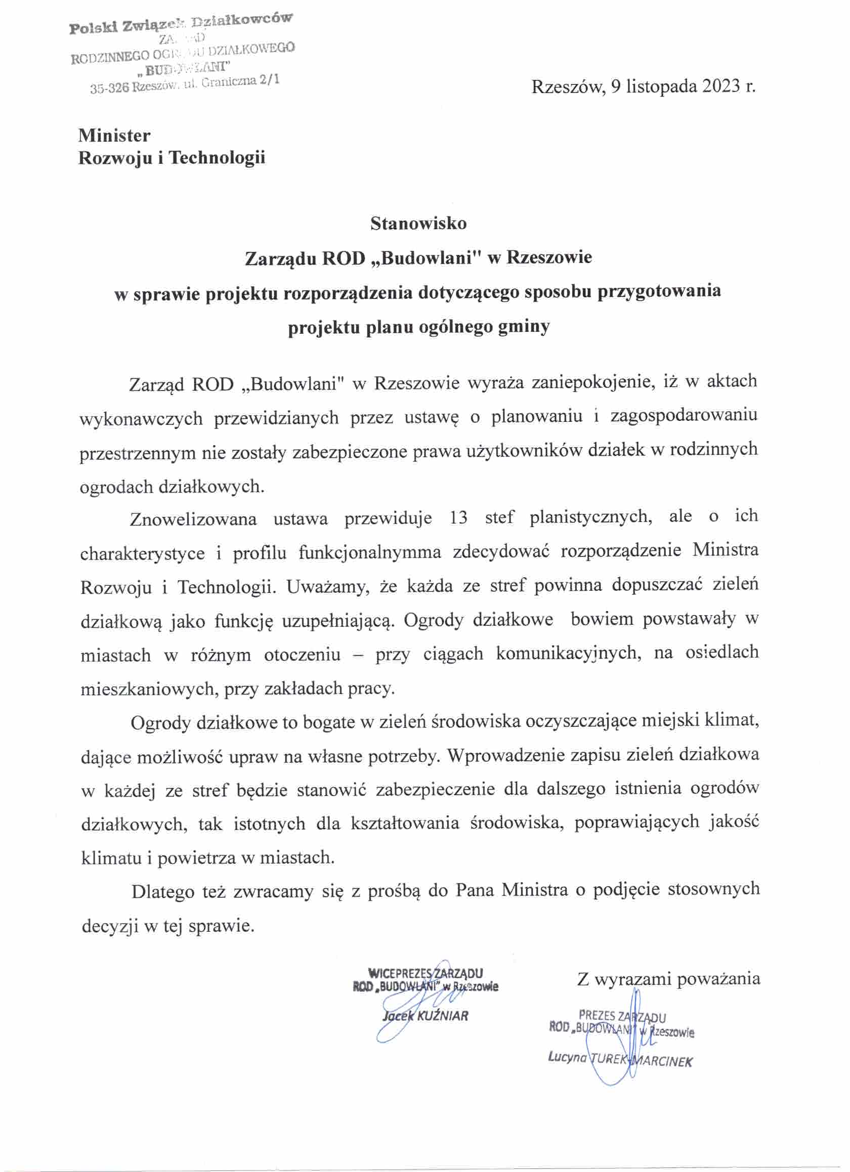 Stanowisko Zarządu ROD Budowlani w Rzeszowie