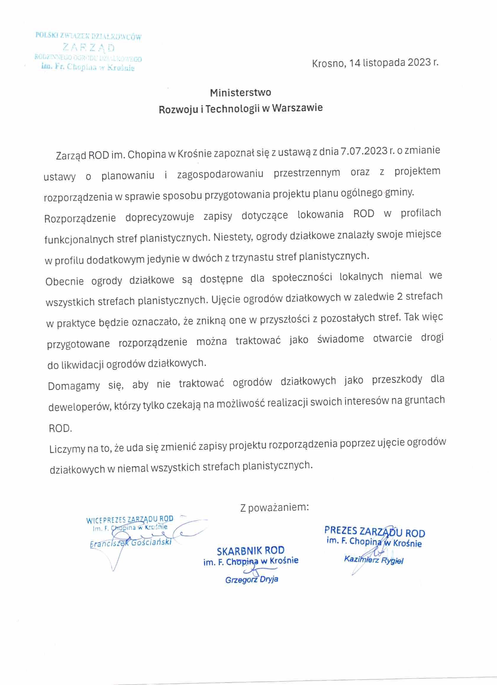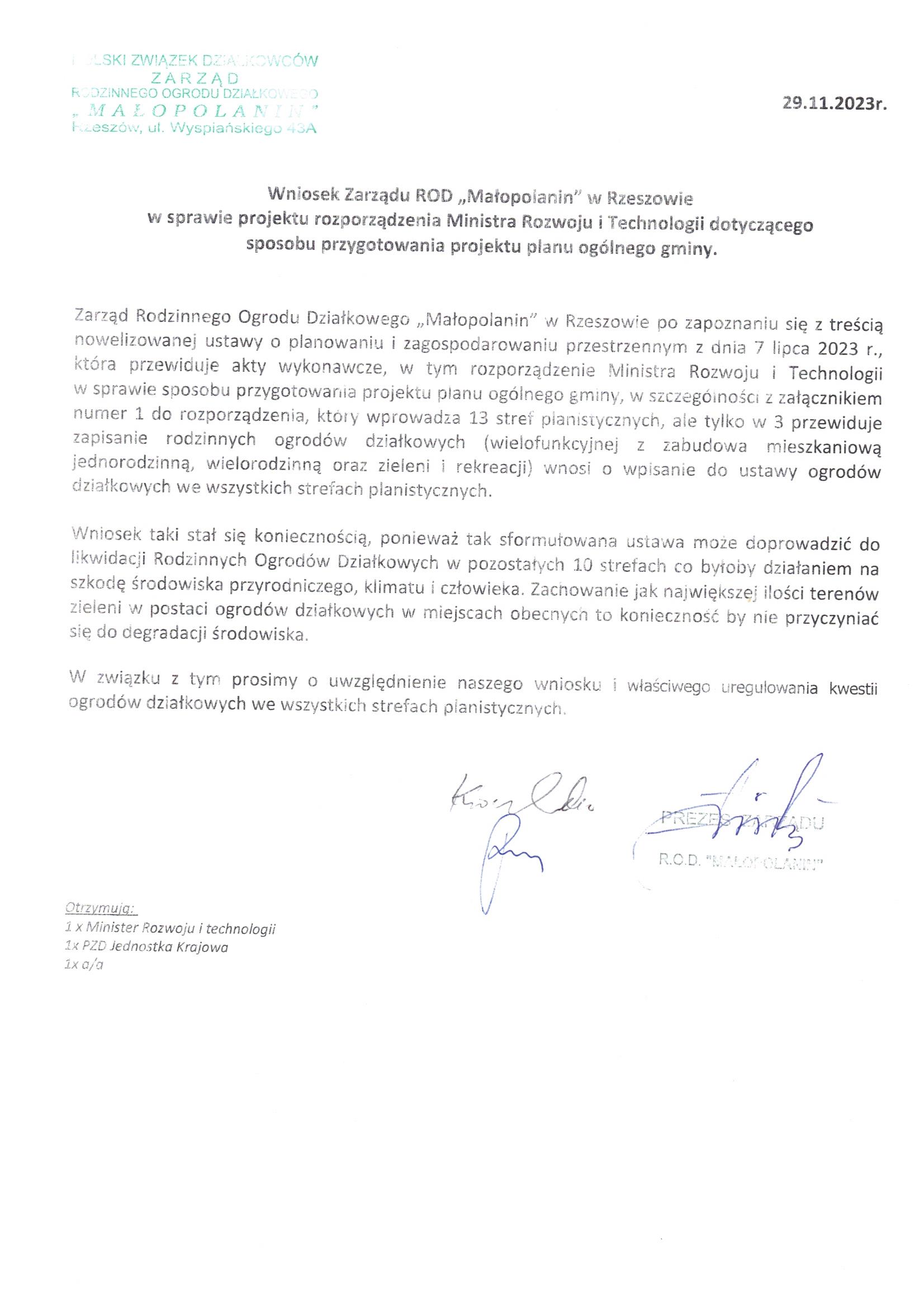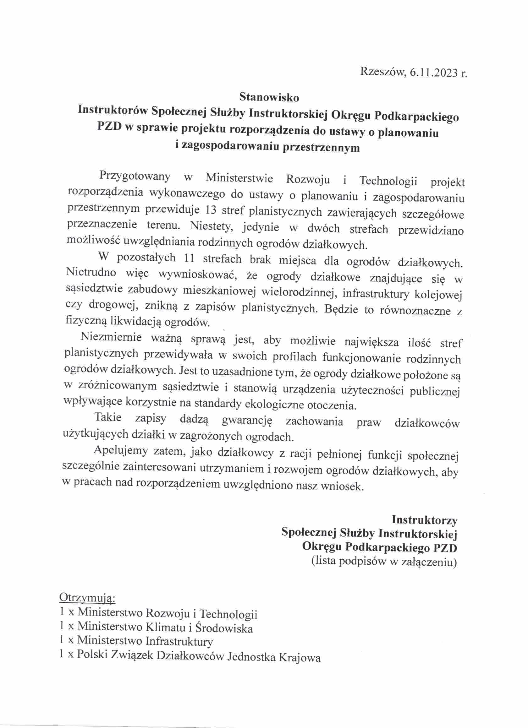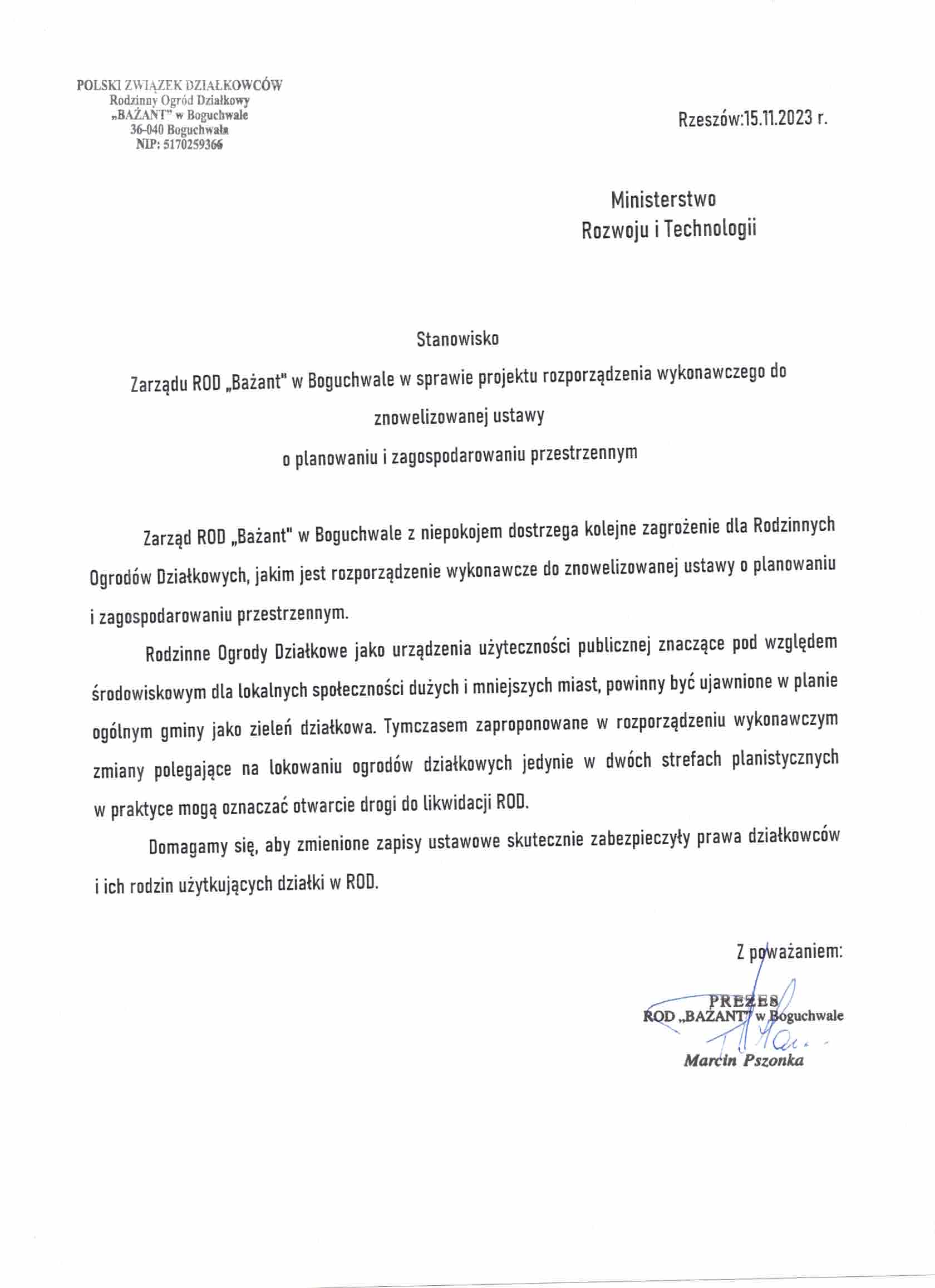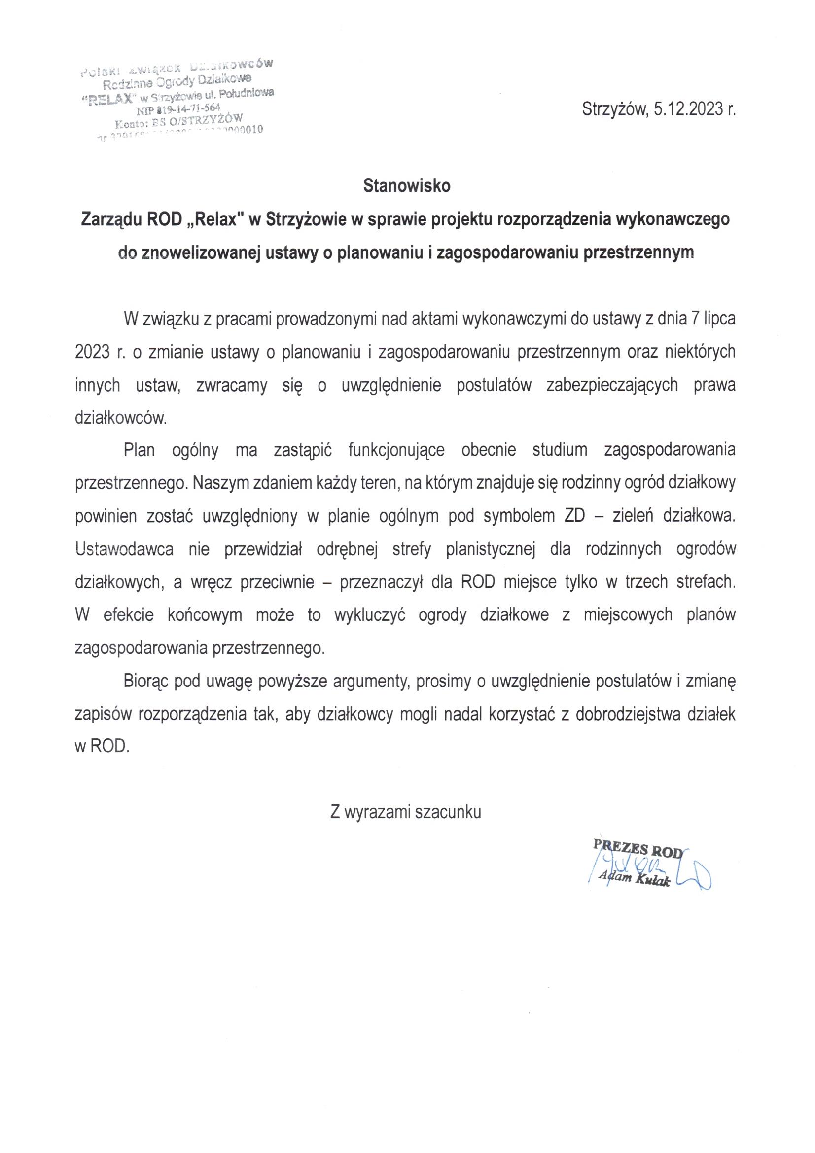 Stanowisko Zarządu ROD Budowlani w Rzeszowie