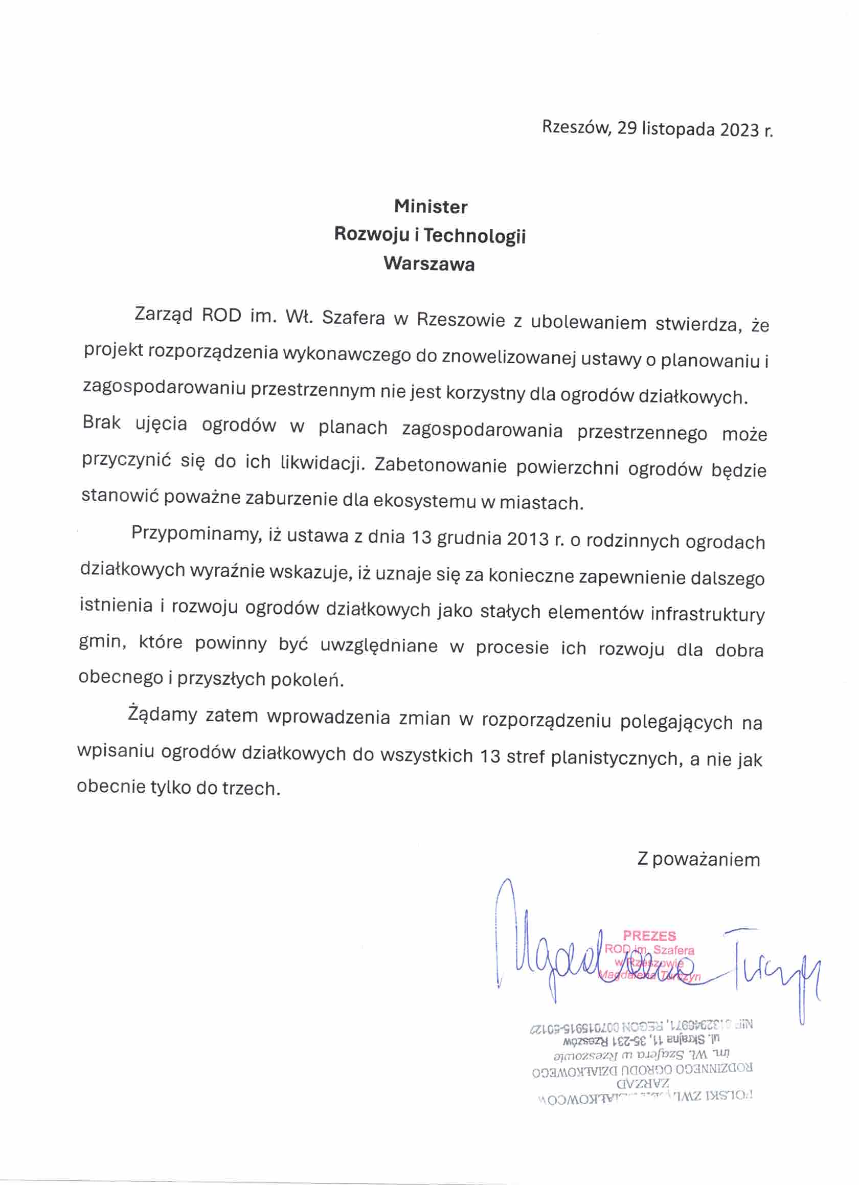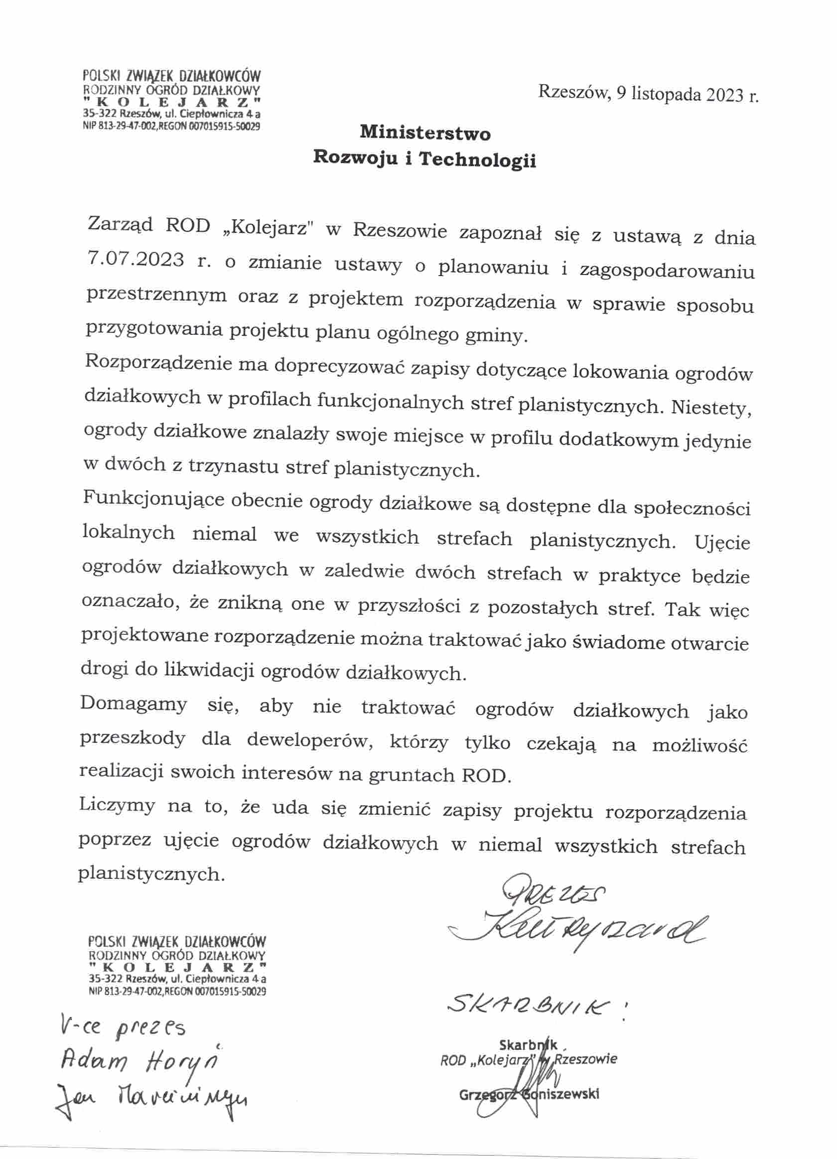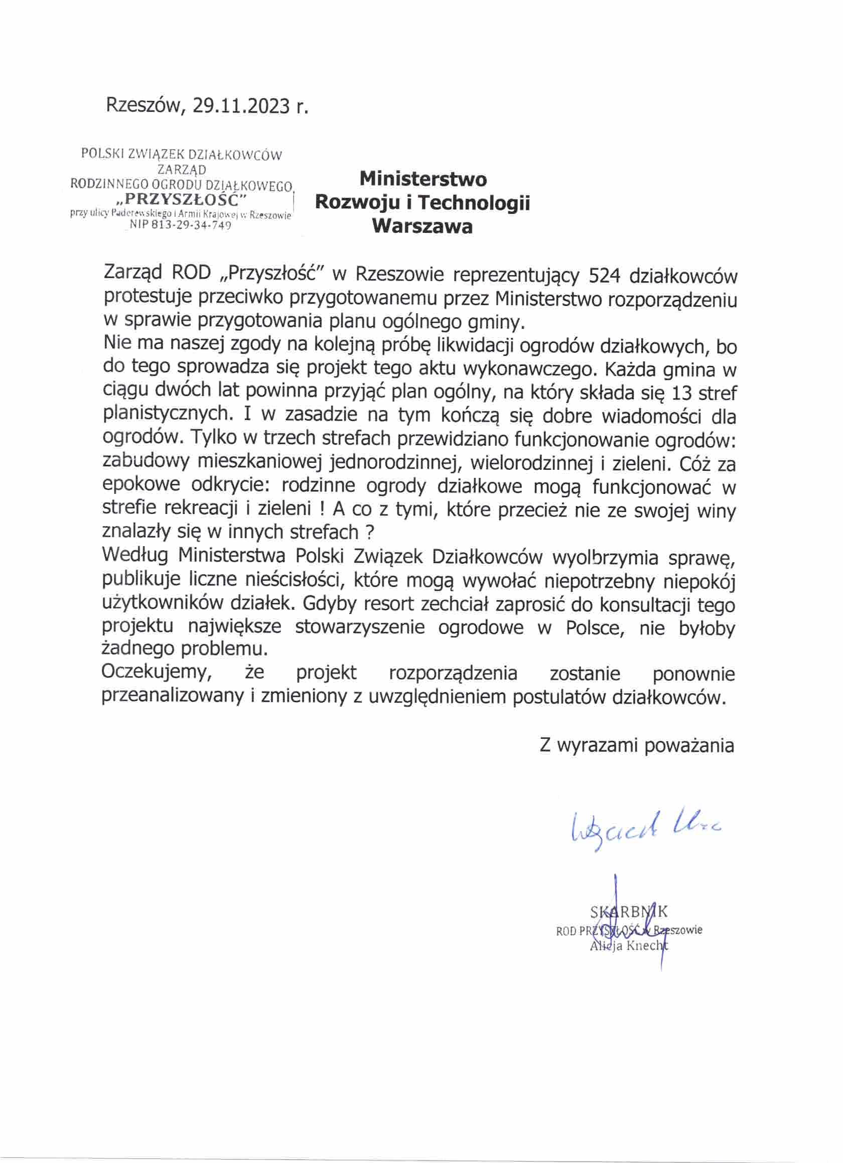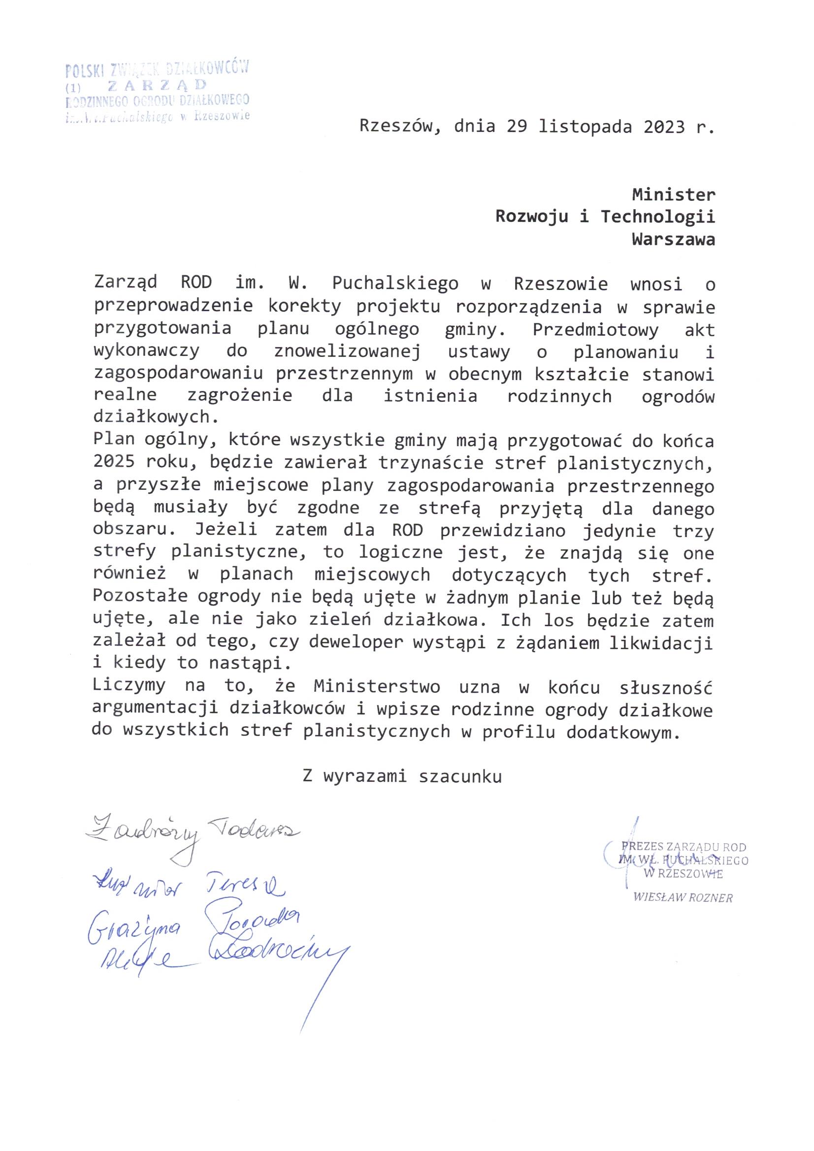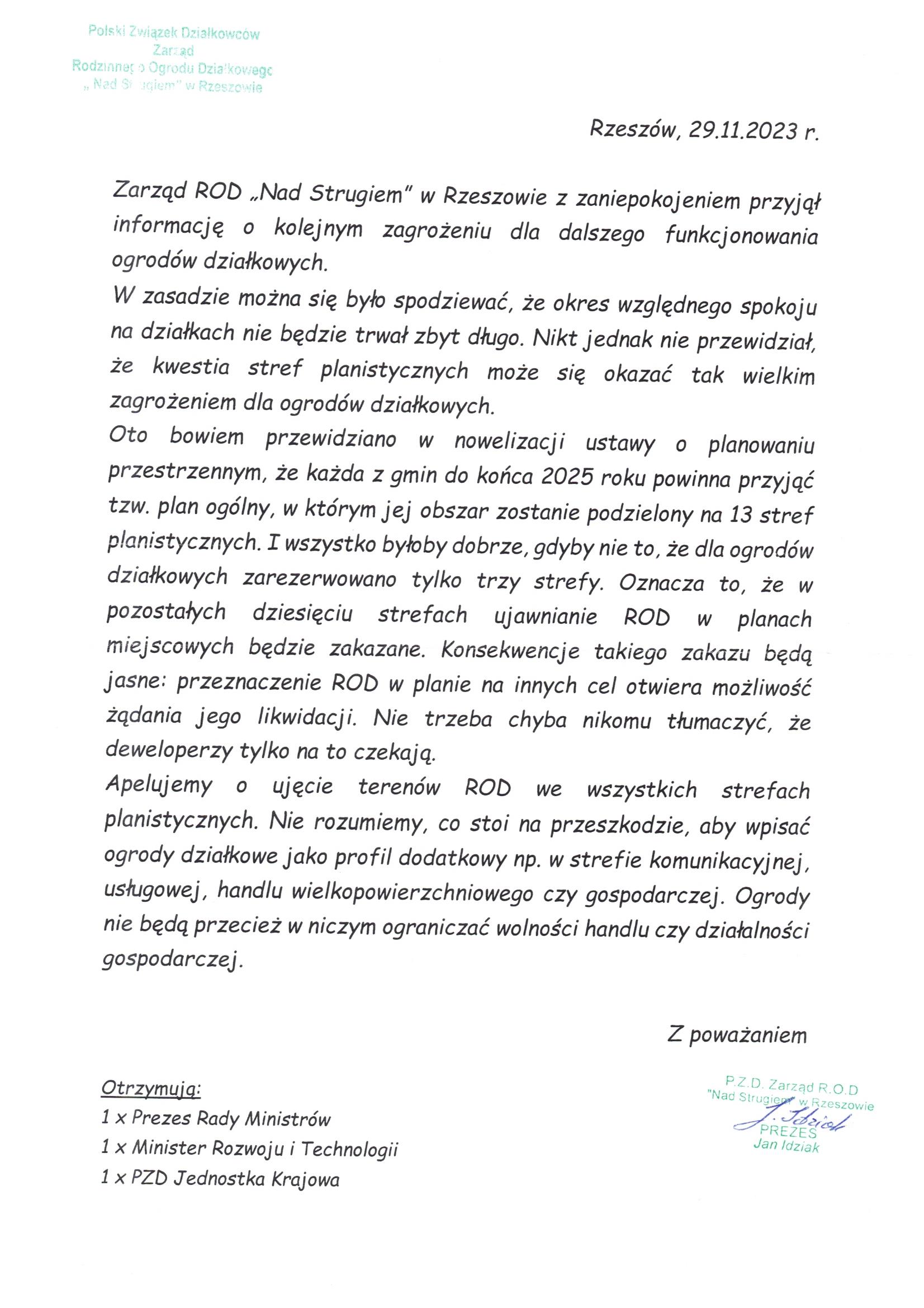 Pismo ROD Przyszłość w Rzeszowie