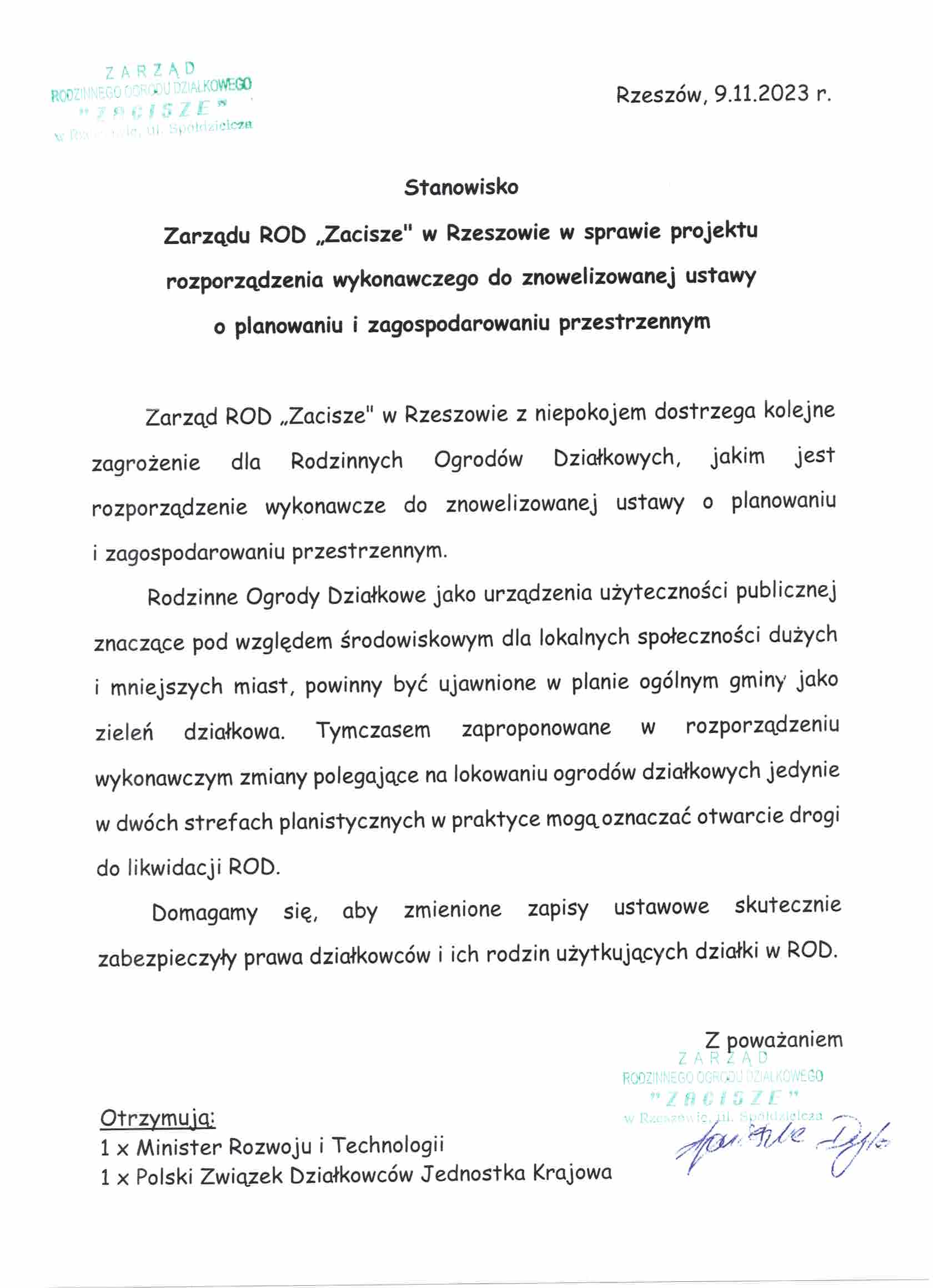Stanowisko Zarządu ROD Zacisze w Rzeszowie