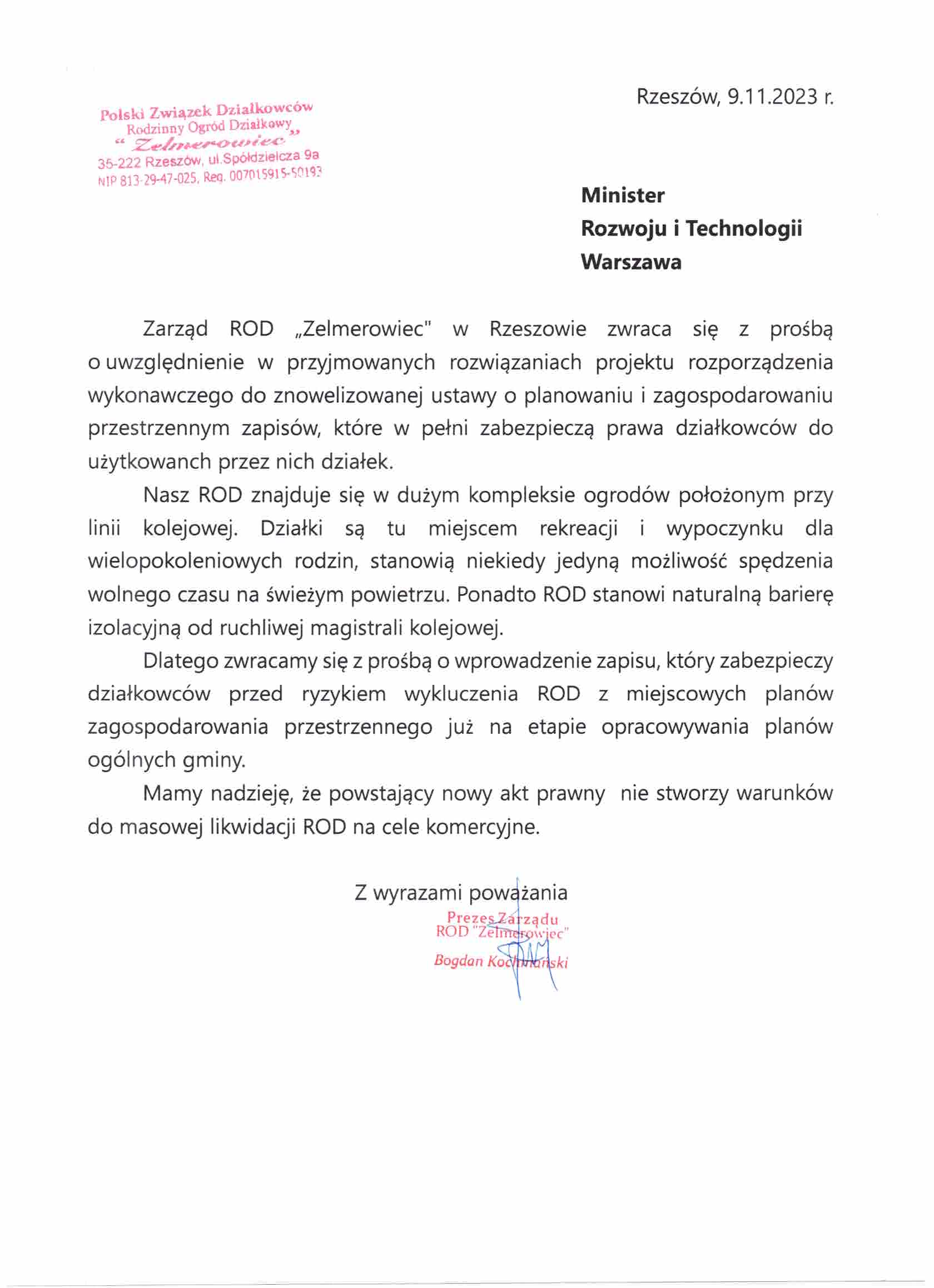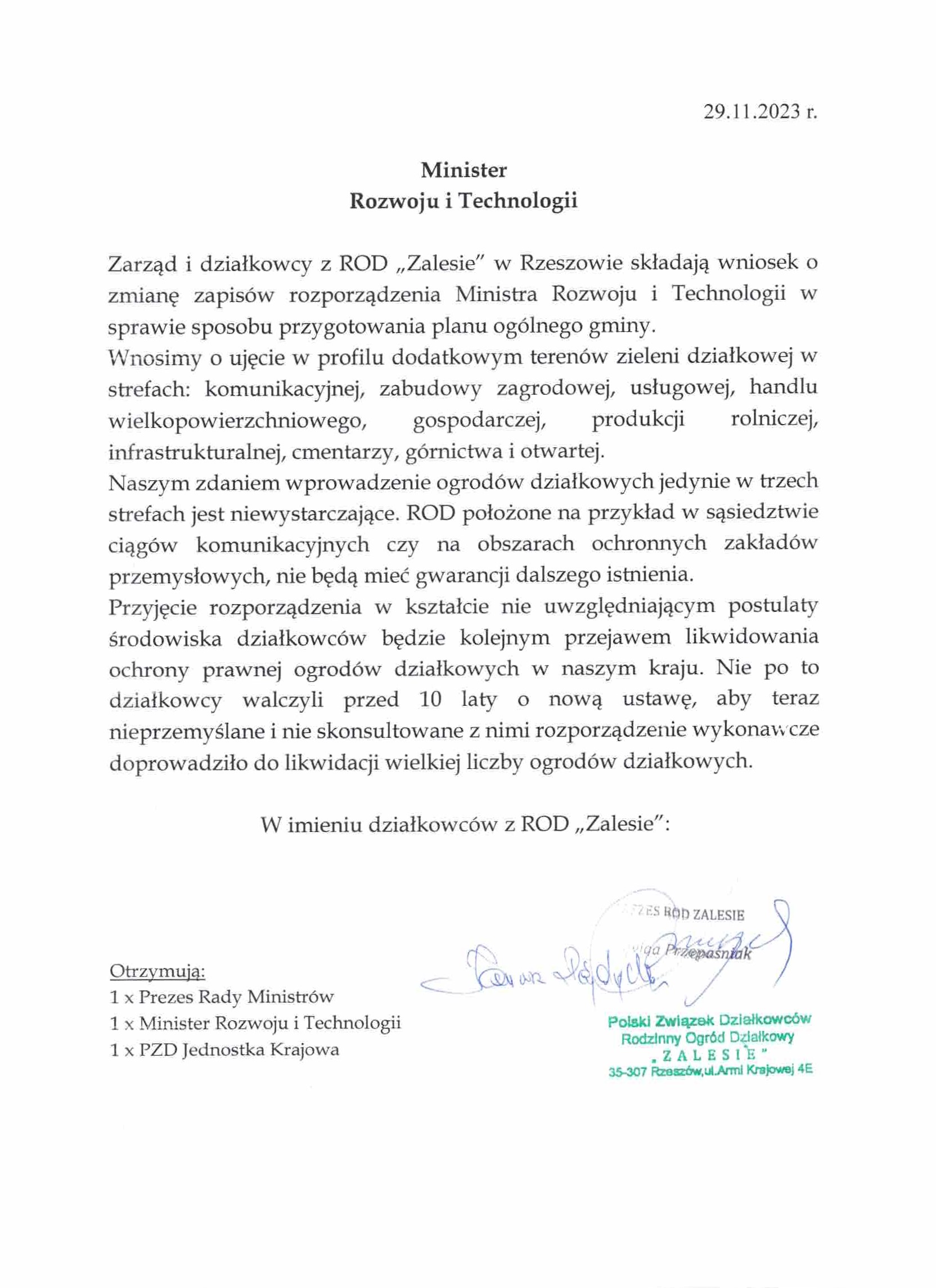Pismo ROD Zalesie w Rzeszowie