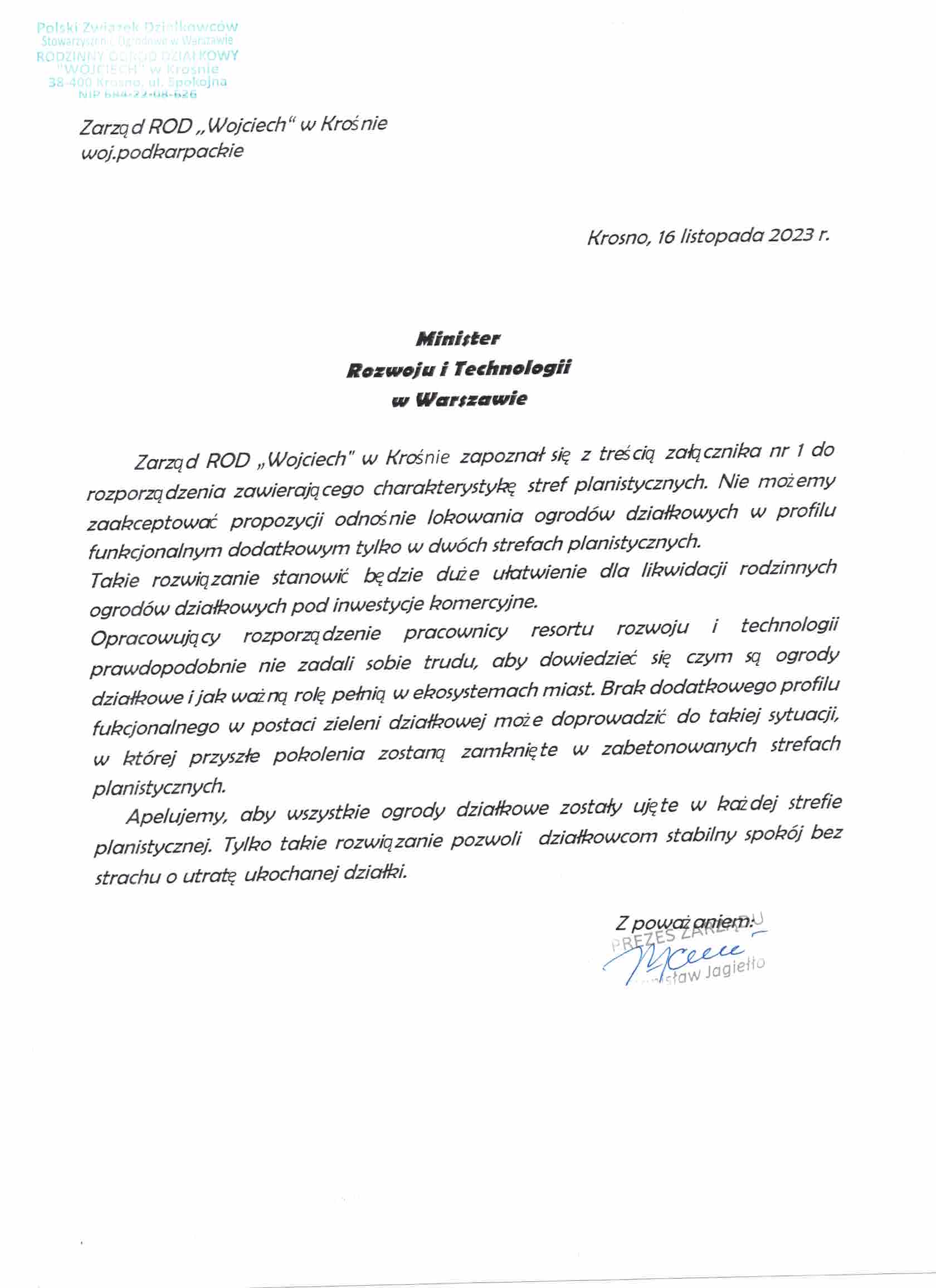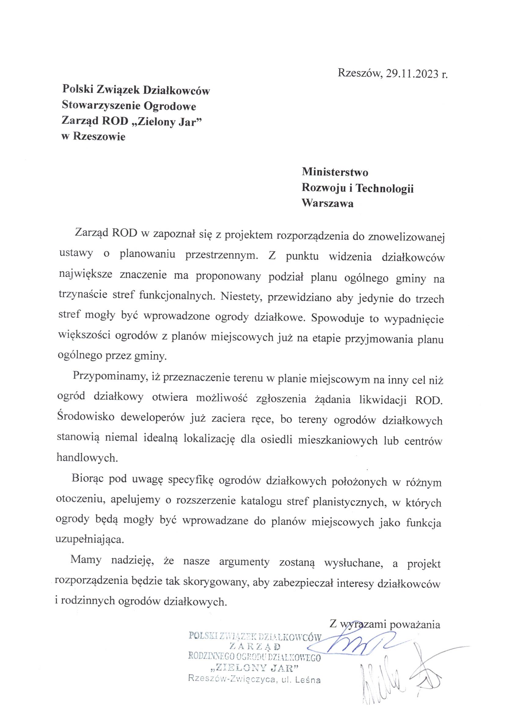 Pismo ROD Zielony Jar w Rzeszowie
