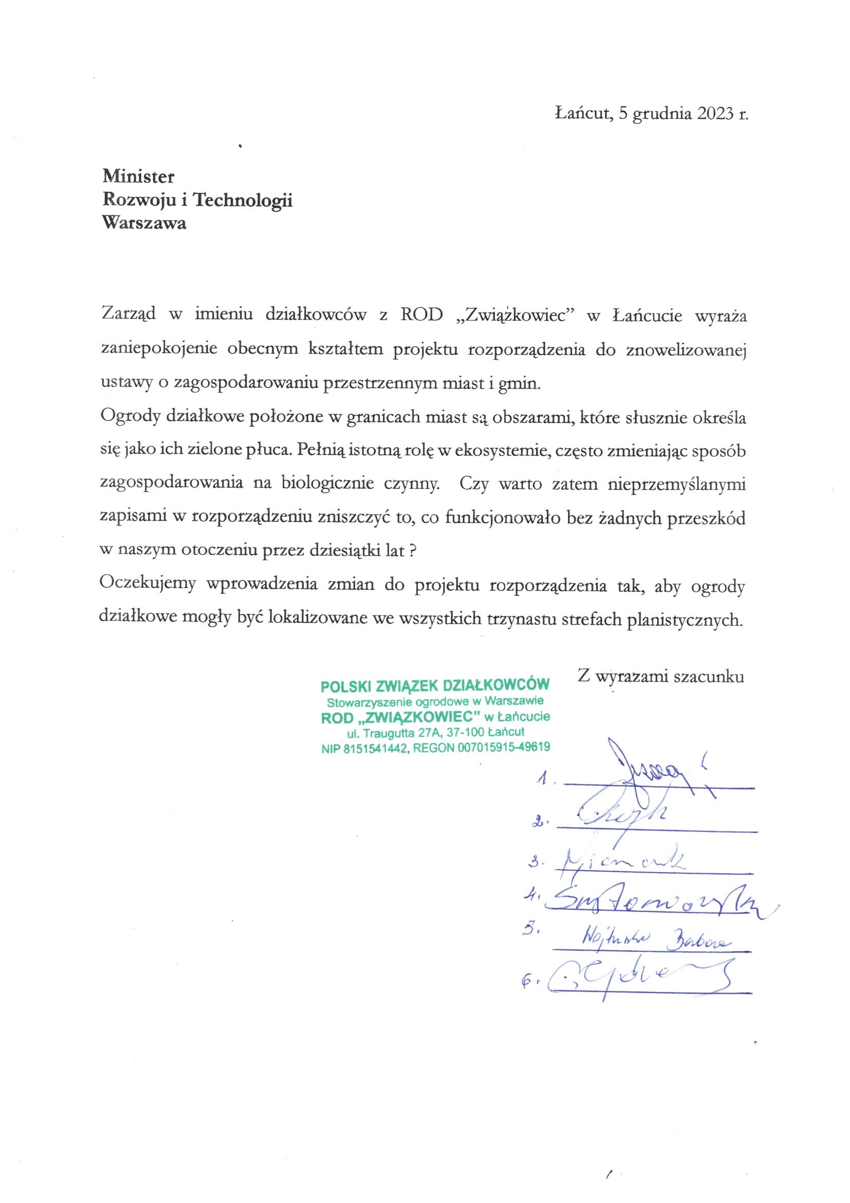 Pismo ROD Związkowiec w Łańcucie