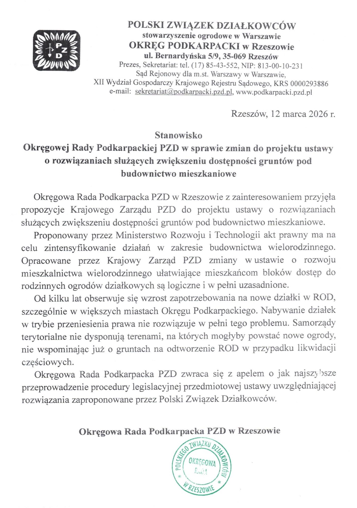 Stanowisko Okręgowej Rady Podkarpackiej PZD w spr. zmian do projektu ustawy o rozwiązaniach służących zwiększeniu dostępności gruntów pod budownictwo mieszkaniowe