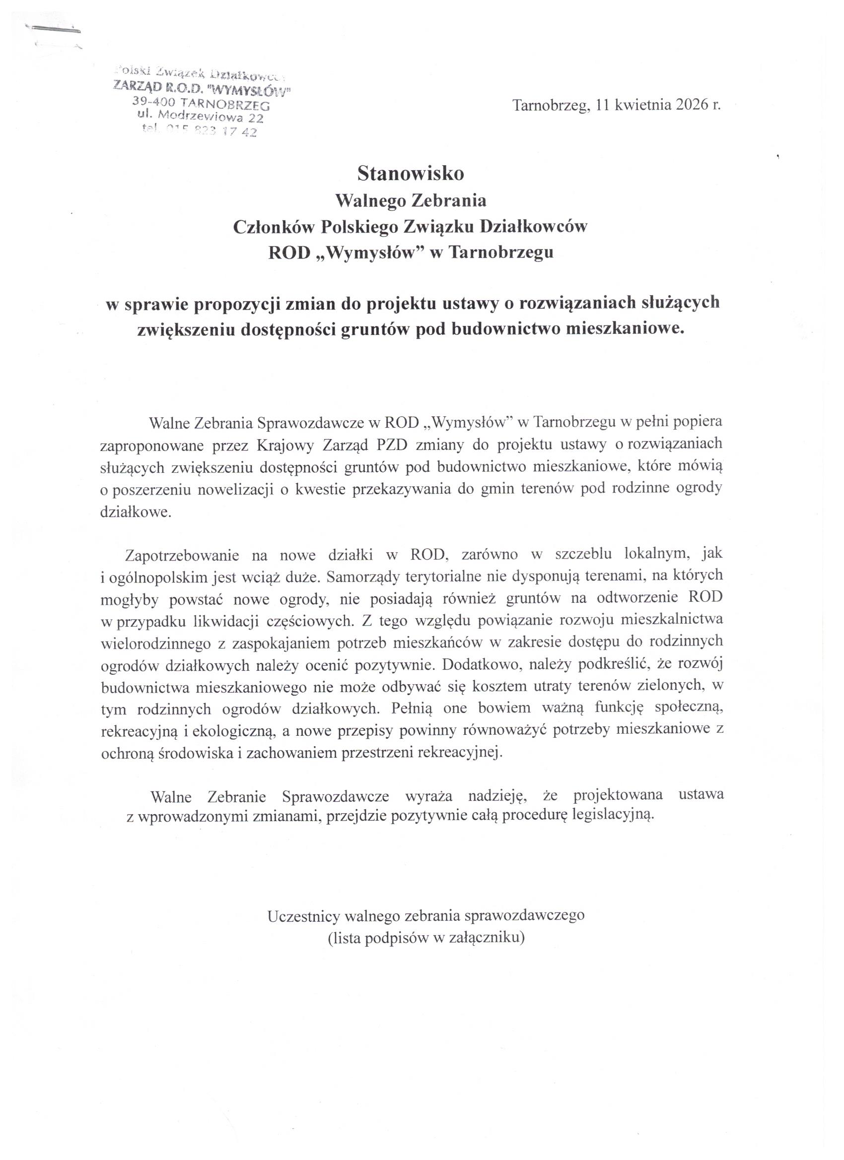 Stanowisko walnego zebrania członków PZD ROD Wymysłów w Tarnobrzegu