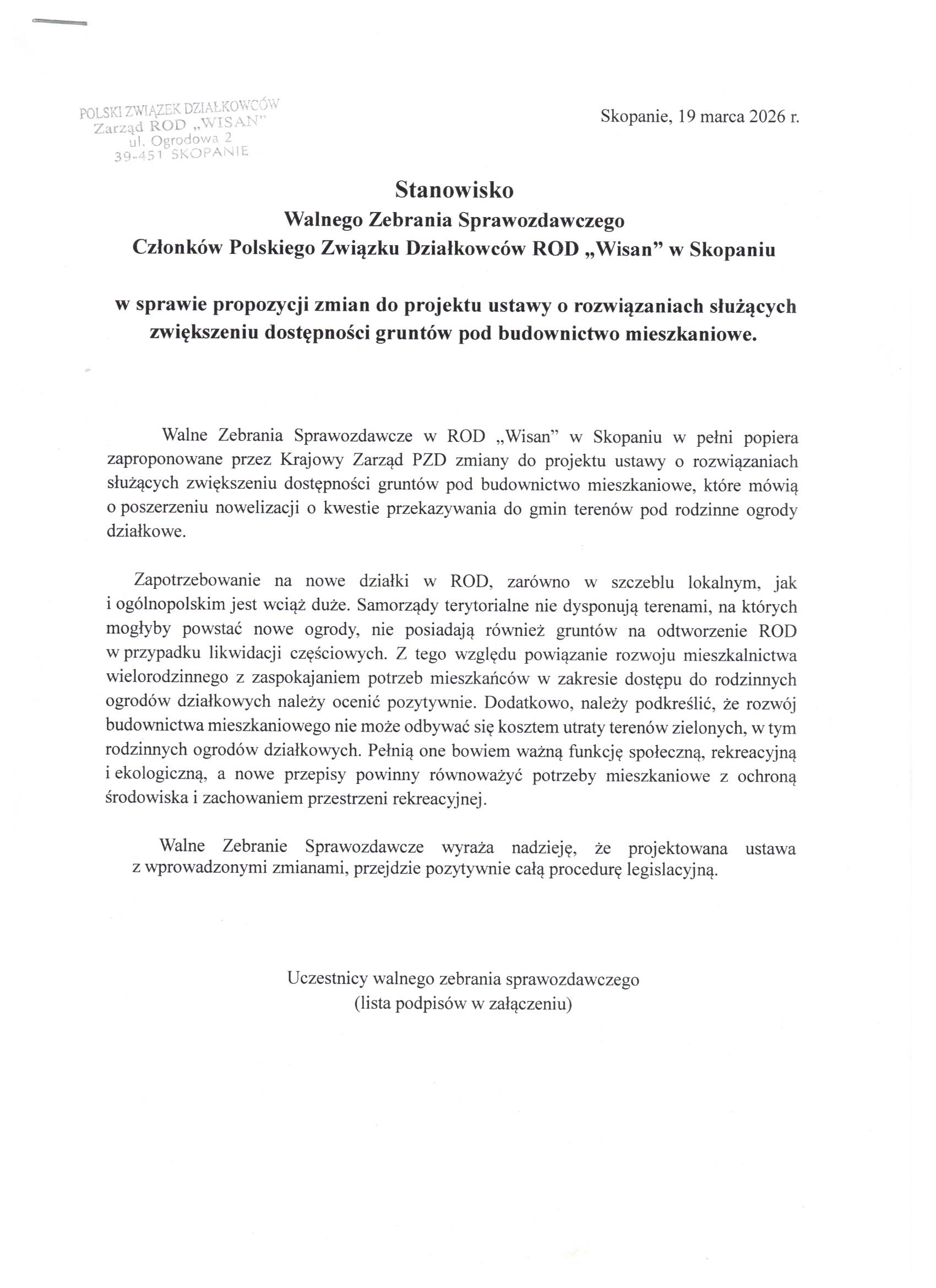 Stanowisko Walnego Zebrania Sprawozdawczego członków PZD ROD Wisan w Skopaniu