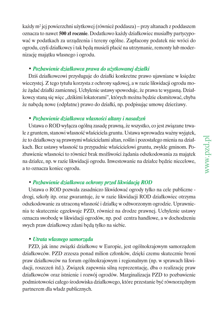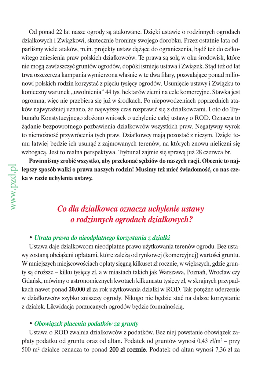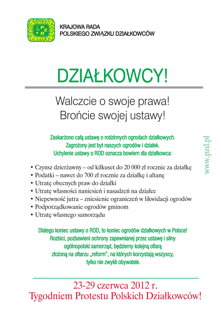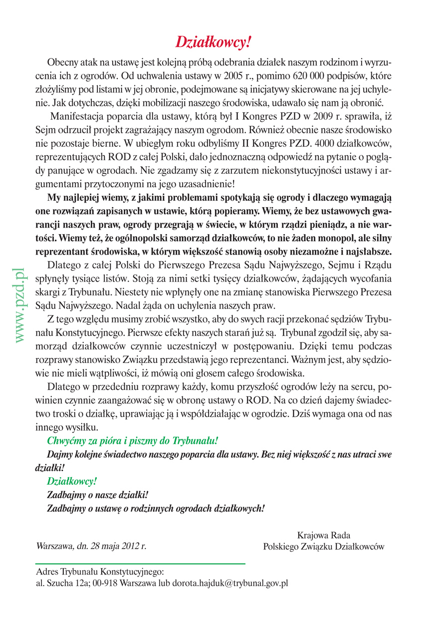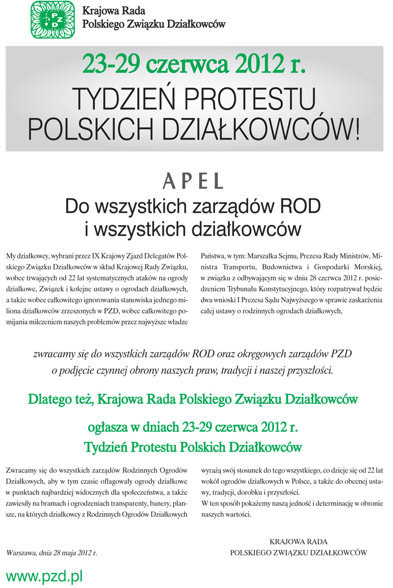 My, działkowcy wybrani przez IX Krajowy Zjazd Delegatów Polskiego Związku Działkowców w skład Krajowej Rady Związku, wobec trwających od 22 lat systematycznych ataków na ogrody działkowe, Związek i kolejne ustawy o ogrodach działkowych, a także wobec całkowitego ignorowania stanowiska jednego miliona działkowców zrzeszonych w PZD w tych sprawach, wobec całkowitego pomijania milczeniem naszych problemów przez najwyższe władze Państwa, w tym Marszałka Sejmu, Prezesa Rady Ministrów, Ministra Transportu, Budownictwa i Gospodarki Morskiej, w związku z odbywającym się w dniu 28 czerwca 2012 r. posiedzeniem Trybunału Konstytucyjnego, który rozpatrywał będzie dwa wnioski I Prezesa Sądu Najwyższego w sprawie zaskarżenia całej ustawy o rodzinnych ogrodach działkowych uznając ją za niekonstytucyjną zwracamy się do wszystkich zarządów ROD oraz okręgowych zarządów PZD o podjęcie czynnej obrony naszych praw, tradycji i naszej przyszłości.