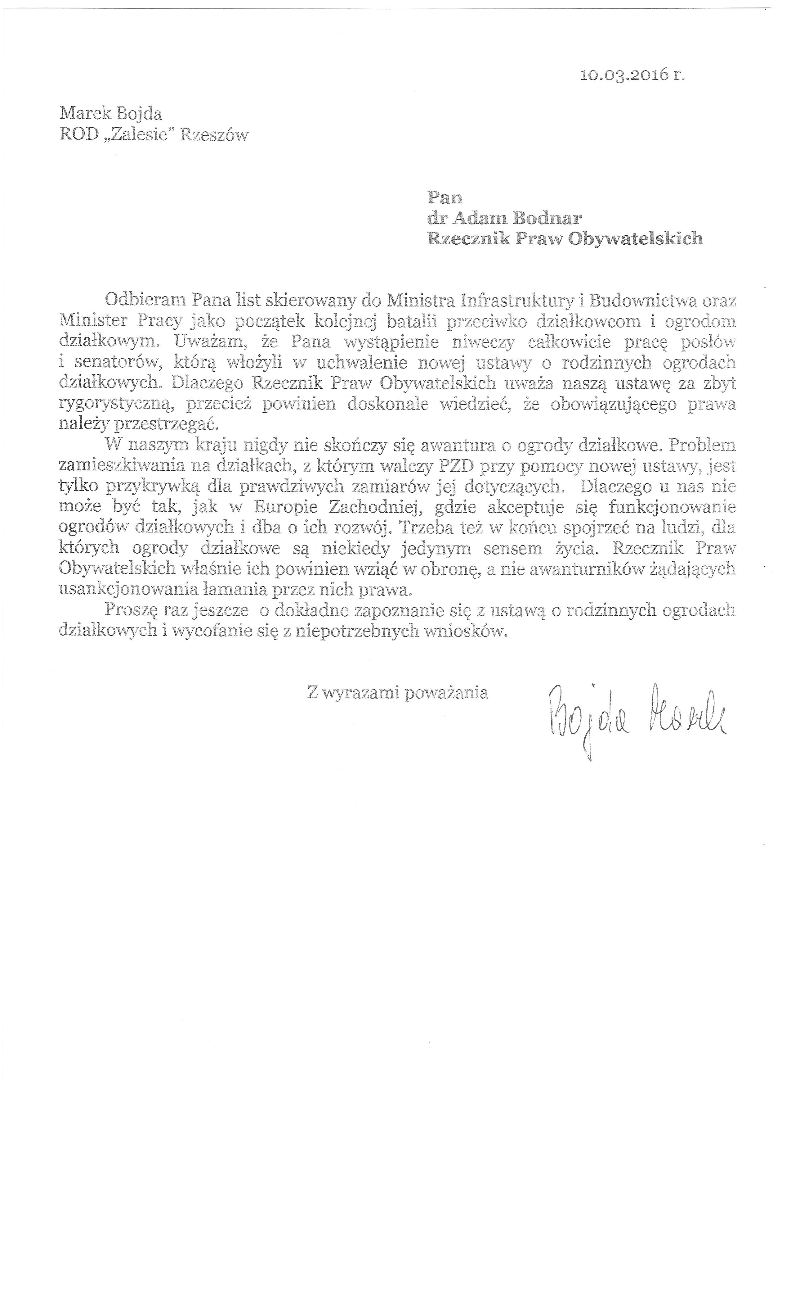 Odbieram Pana list skierowany do Ministra Infrastruktury i Budownictwa oraz Minister Pracy jako początek kolejnej batalii przeciwko działkowcom i ogrodom działkowym. Uważam, że Pana wystąpienie niweczy całkowicie pracę posłów i senatorów, którą włożyli w uchwalenie nowej ustawy o rodzinnych ogrodach działkowych. Dlaczego Rzecznik Praw Obywatelskich uważa naszą ustawę za zbyt rygorystyczną, przecież powinien doskonale wiedzieć, że obowiązującego prawa należy przestrzegać.