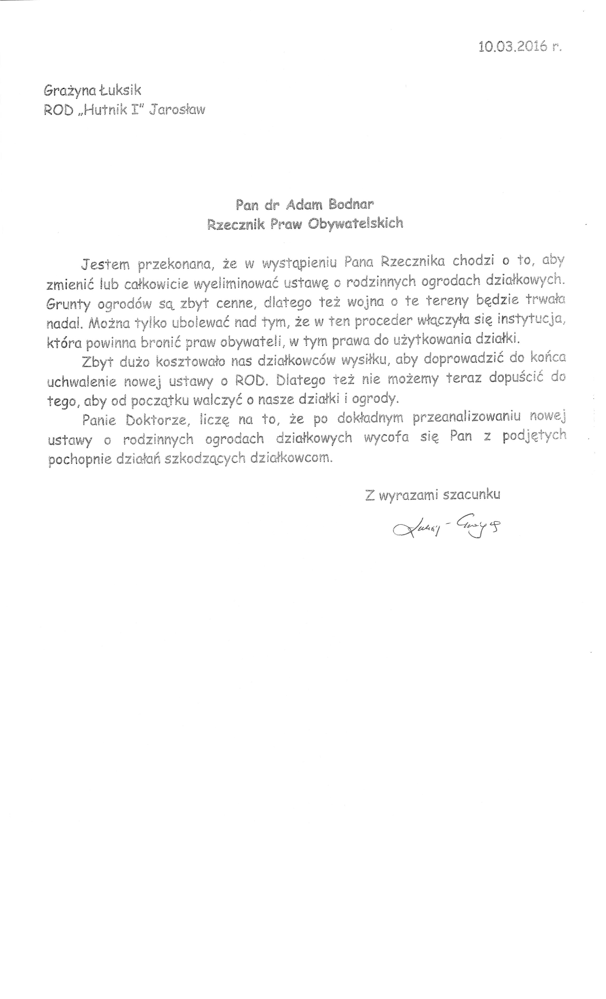 List Pani Grażyny Łuksik