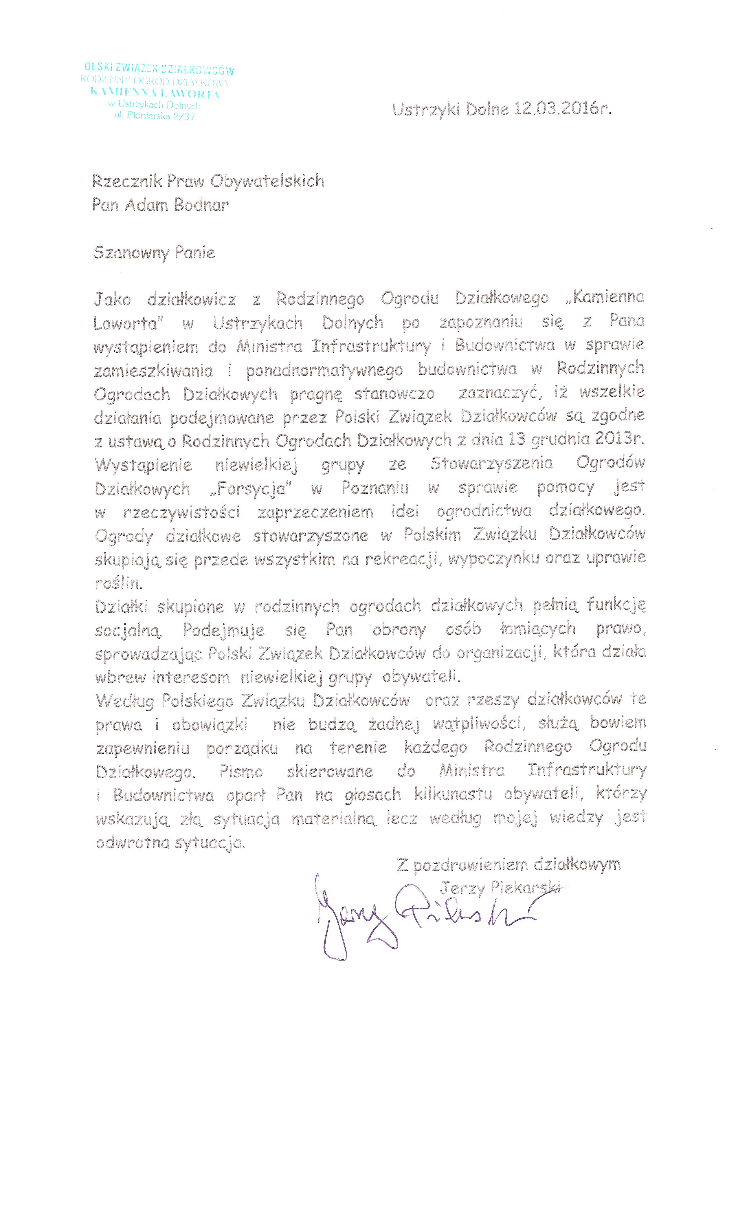 Wciąż napływają listy z ROD oraz indywidualnych działkowców w związku z wystąpieniem Rzecznika Praw Obywatelskich