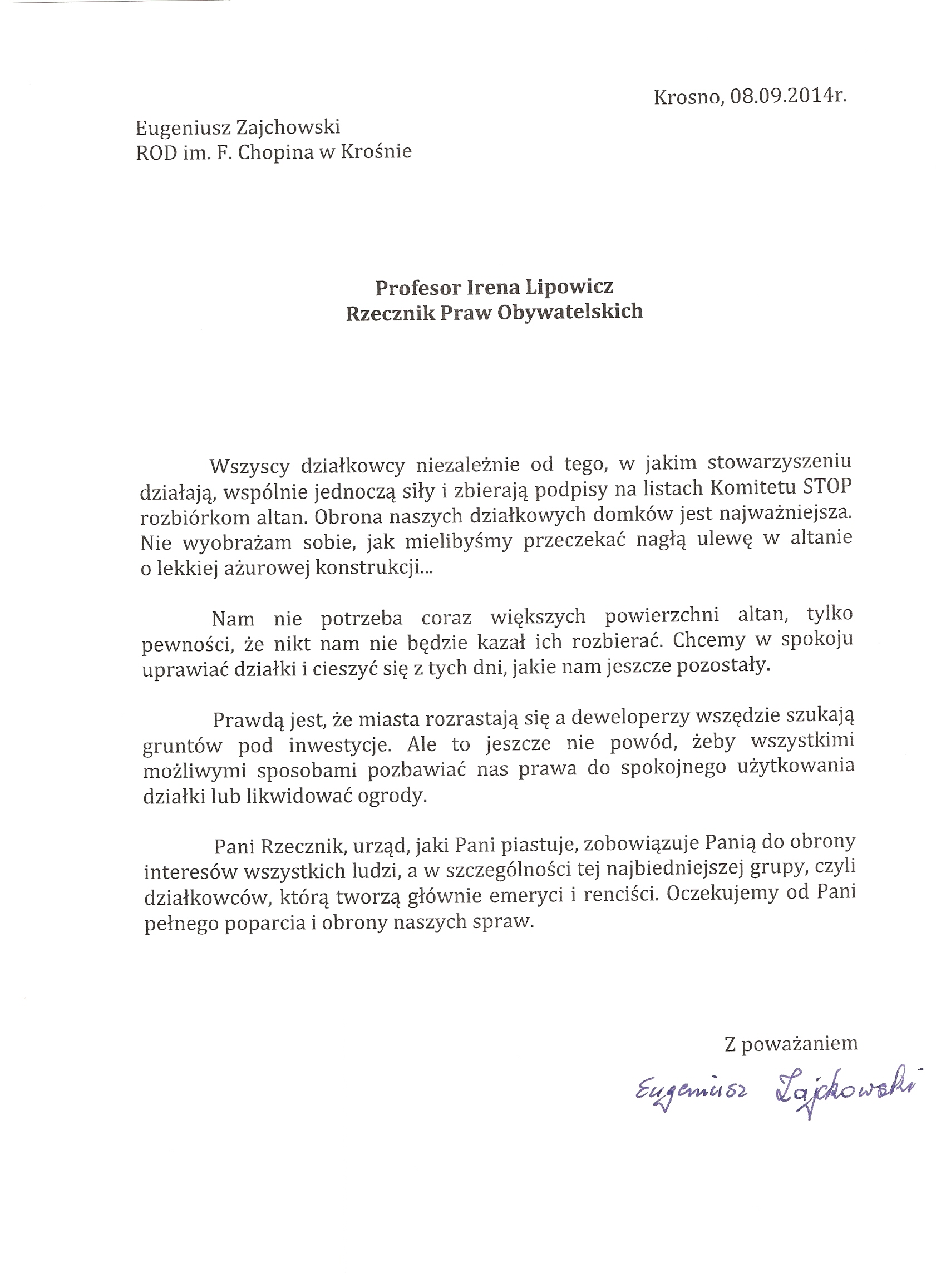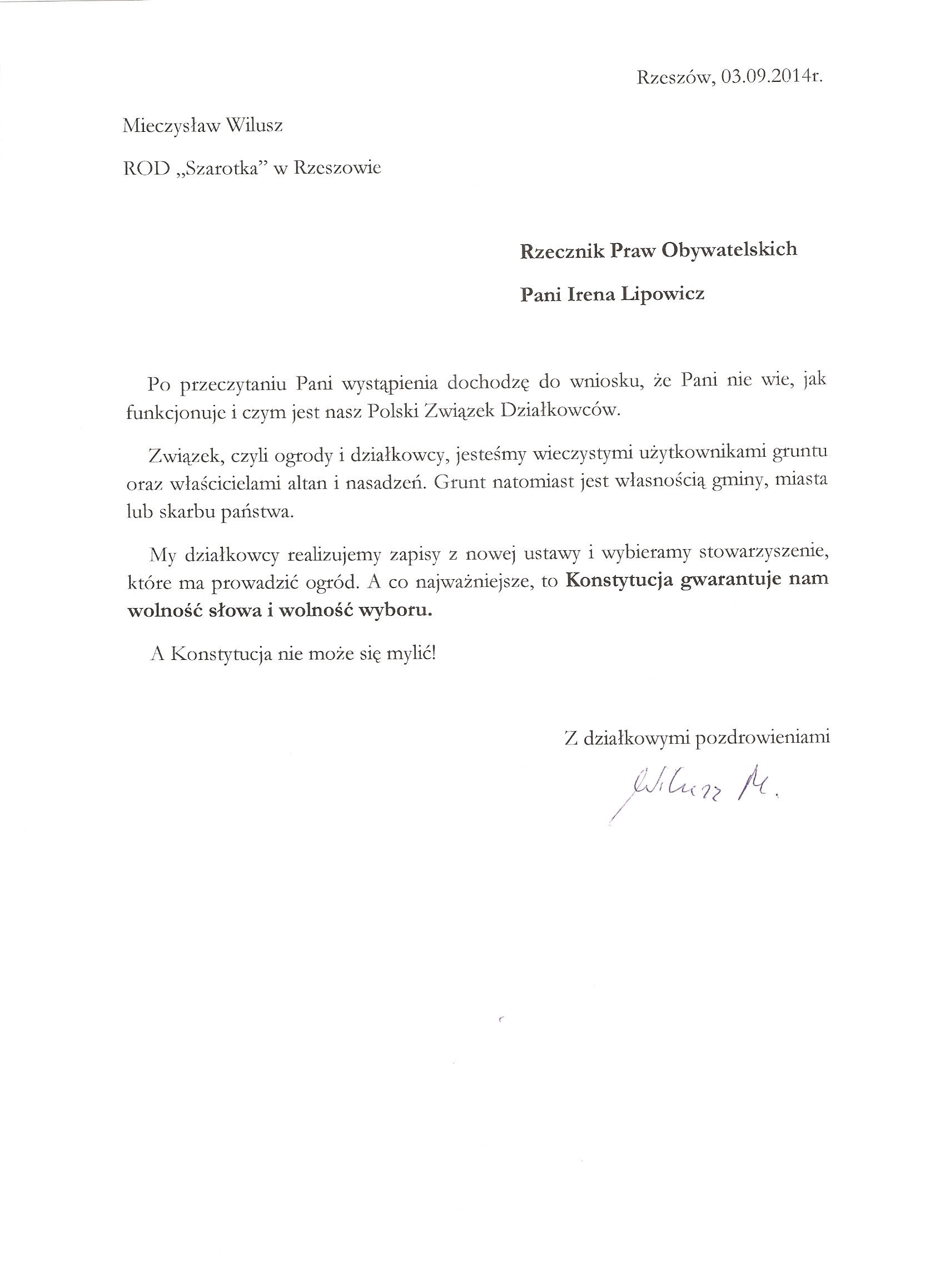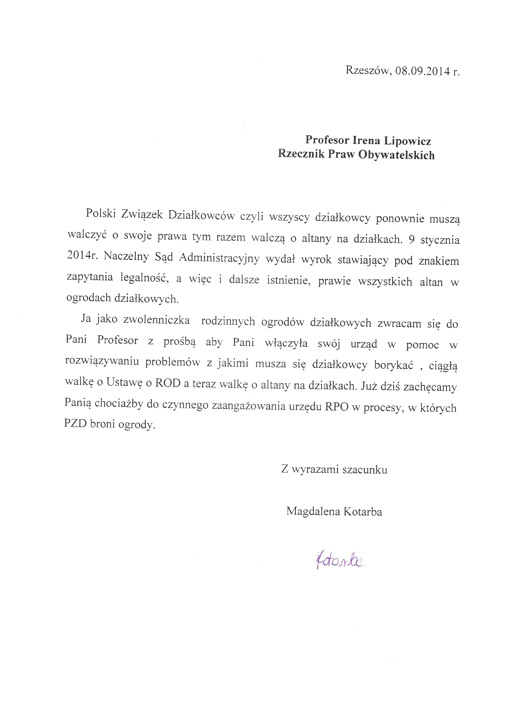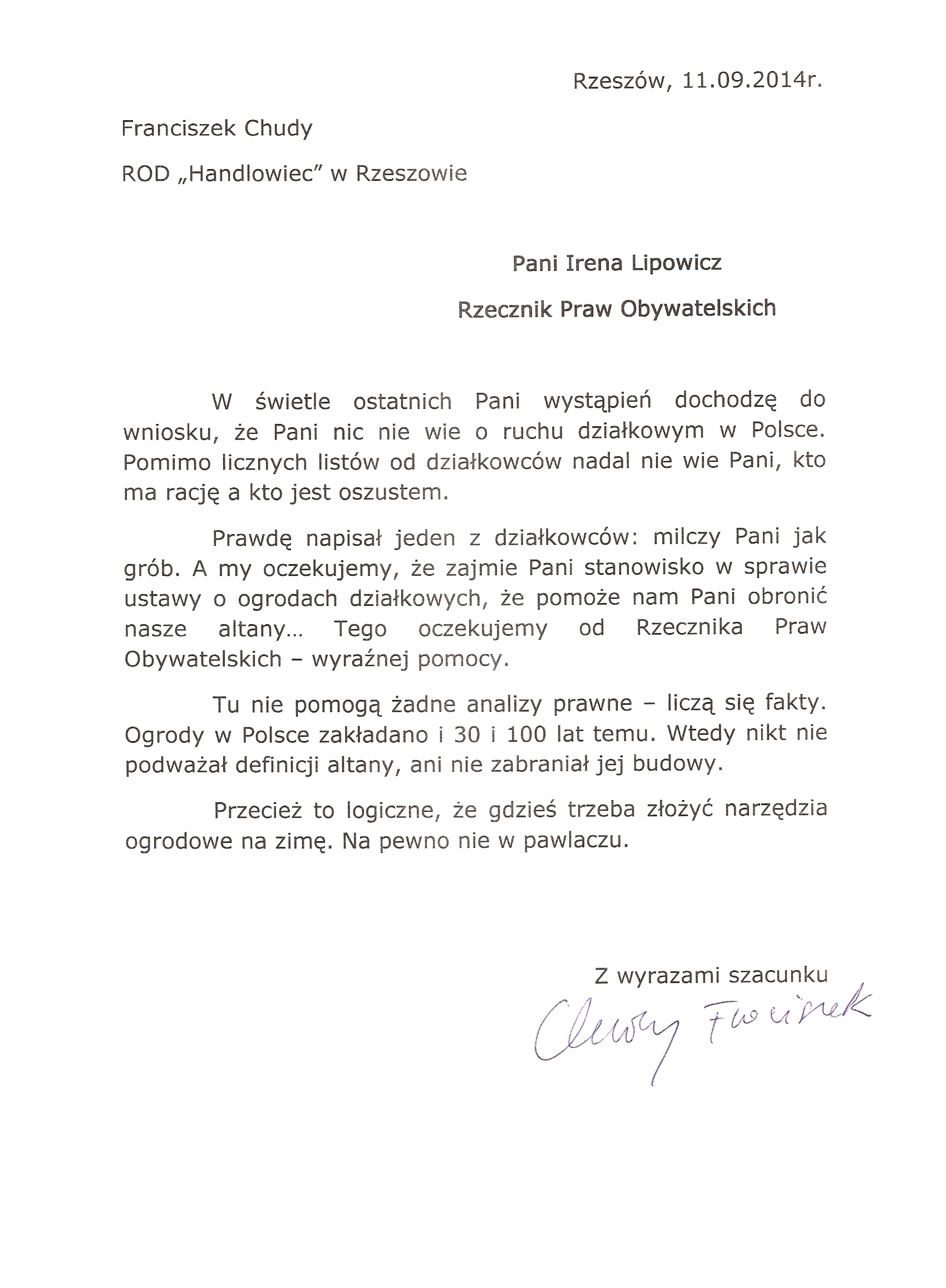 Działkowcy piszą do Rzecznika Praw Obywatelskich p. Ireny Lipowicz.