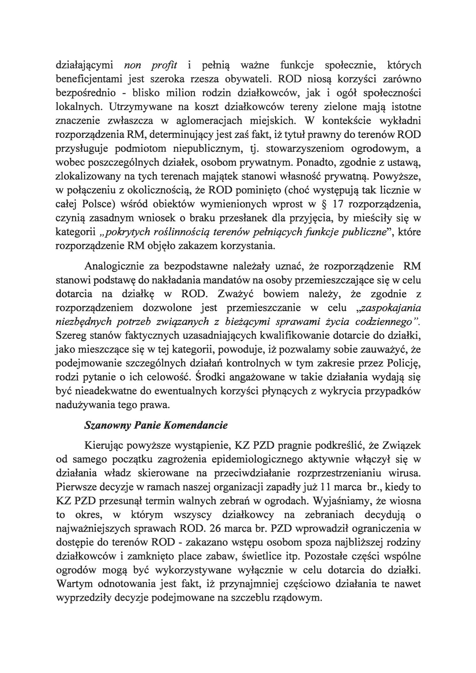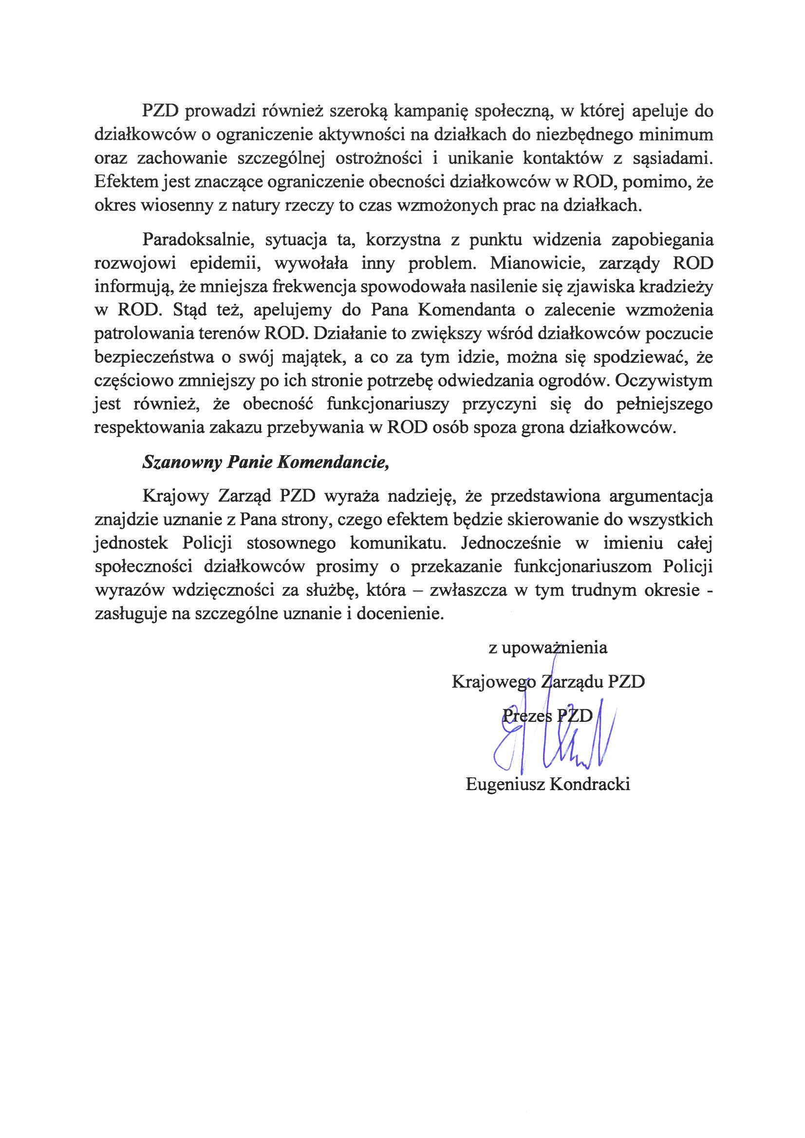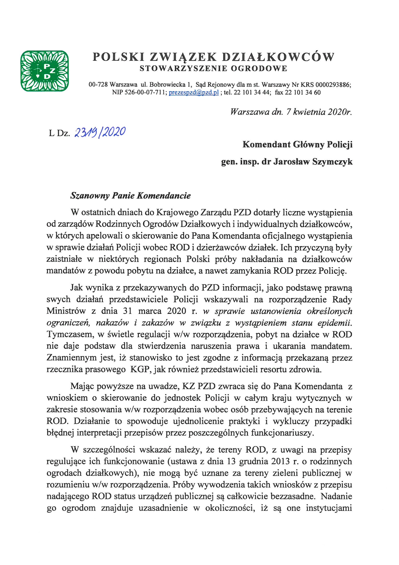 Krajowy Zarząd PZD wystąpił do Komendanta Głównego Policji z wnioskiem o skierowanie do wszystkich jednostek wytycznych, które wykluczą przypadki nadinterpretacji przepisów „przeciwepidemiologicznych” przy ich stosowaniu wobec działkowców. KZ poinformował też o działaniach służących zapobieganiu rozwojowi epidemii wdrożonych przez PZD oraz zaapelował o zwiększenie częstotliwości patrolowania okolic ogrodów.