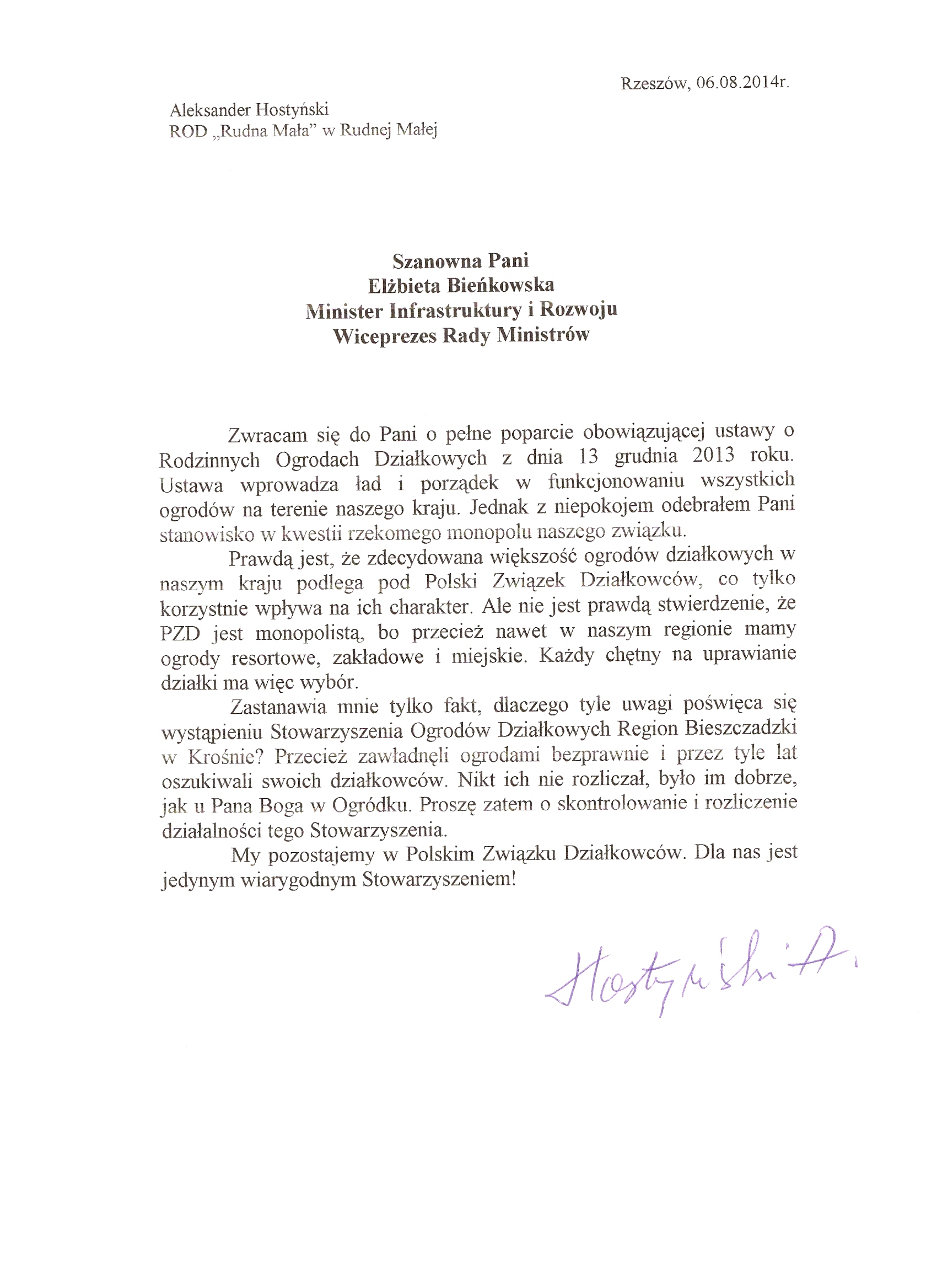 "Zwracam się do Pani o pełne popracie oboiwącującej ustawy o Rodzinnych Ogrodach Działkowych (...)"