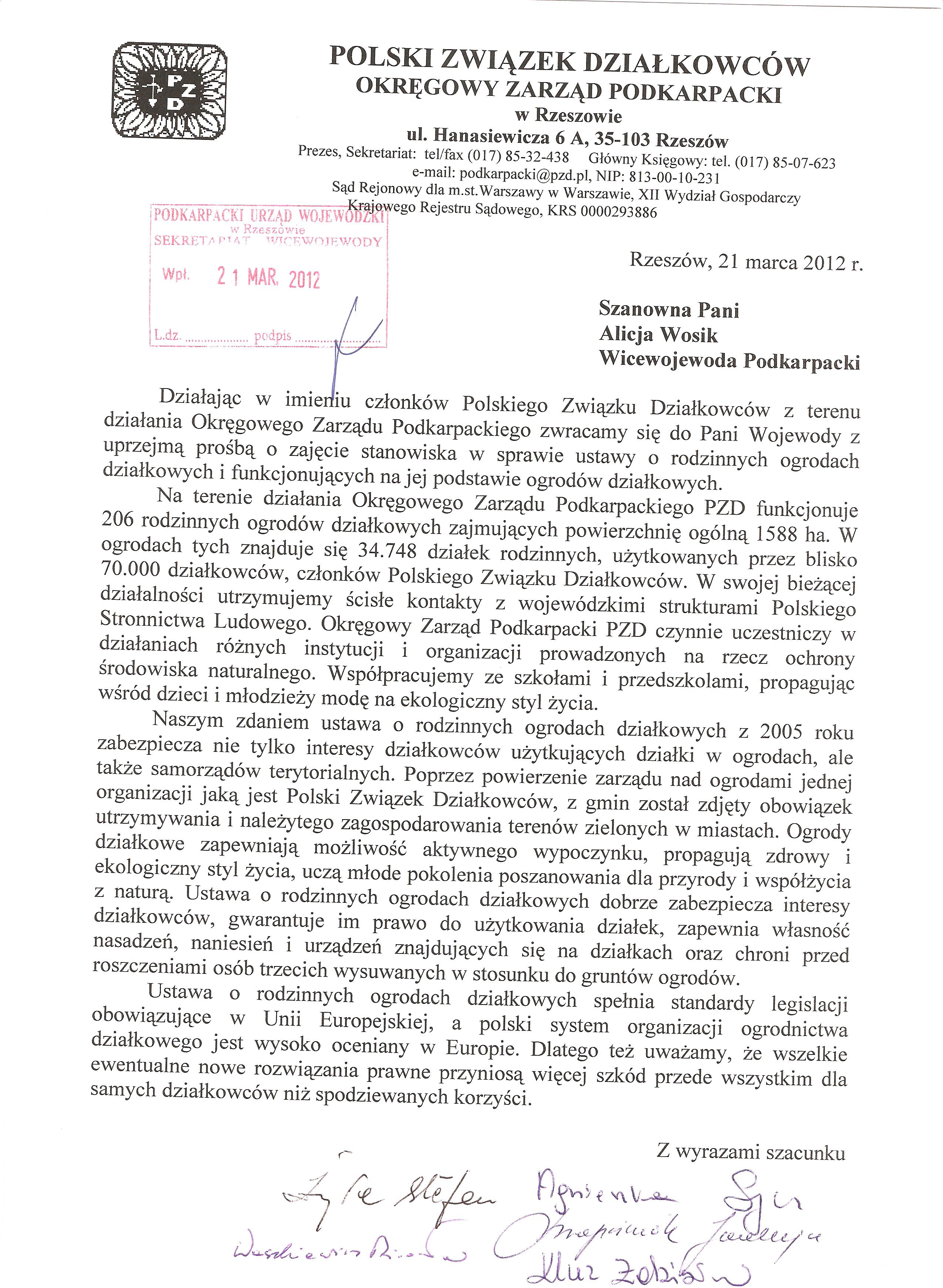 Apel Konferencji Okręgowej PZD w Rzeszowie do Prezydenta Rzeczpospolitej Polskiej w sprawie obywatelskiego projektu ustawy o ogrodach działkowych