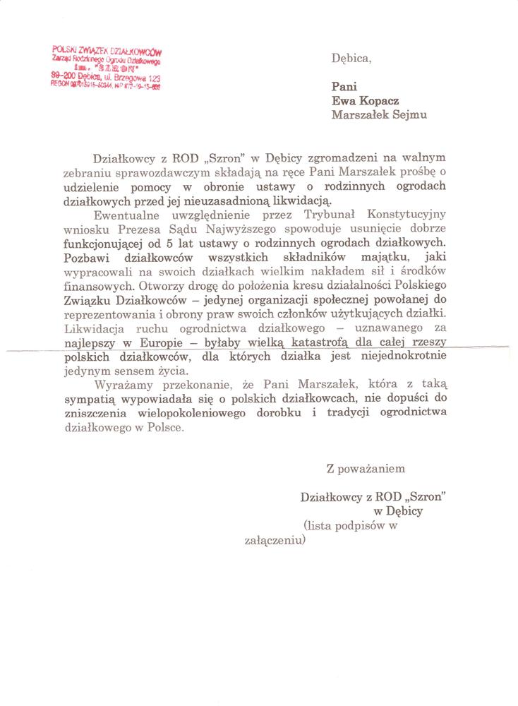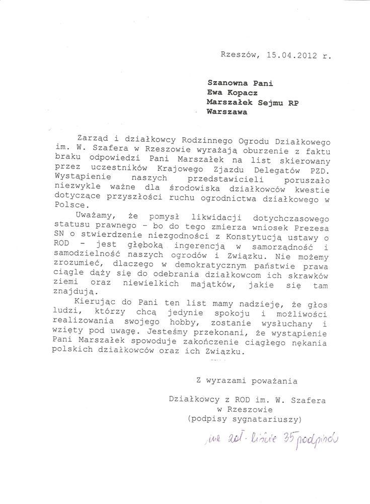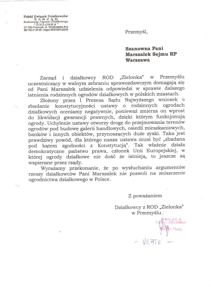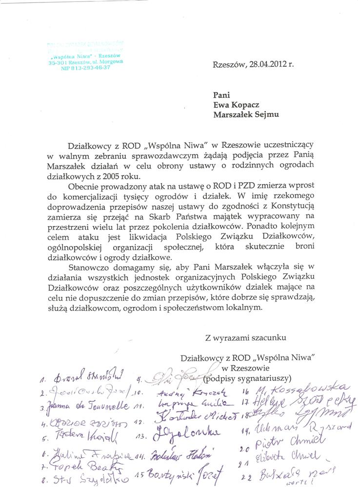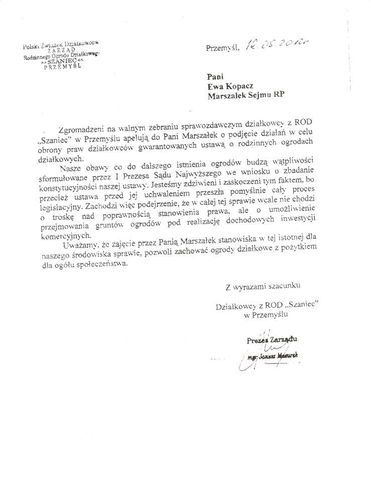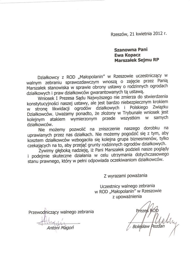 Działając w imieniu rzeszowskich działkowców zwracamy się o pomoc w obronie działkowców, ustawy o rodzinnych ogrodach działkowych i Polskiego Związku Działkowców. Jesteśmy przekonani, że głos najwyższego przedstawiciela Sejmu, przesądzi o pozostawieniu ustawy o ROD w niezmienionej formie i pozwoli na dalsze istnienie oraz rozwój ogrodnictwa działkowego w naszym kraju.