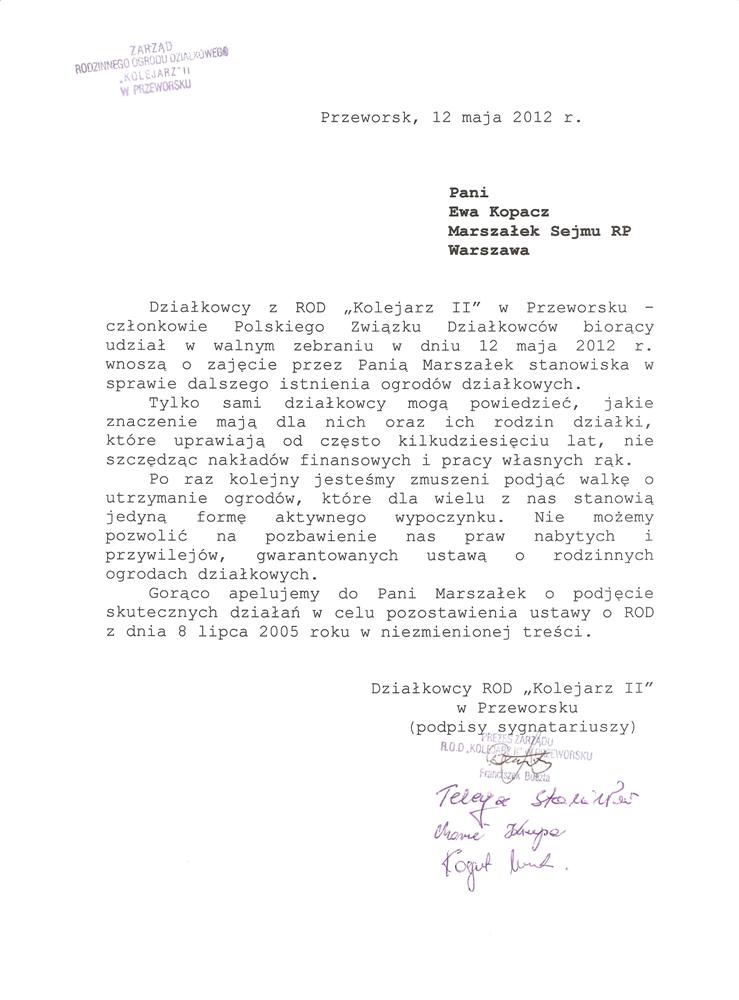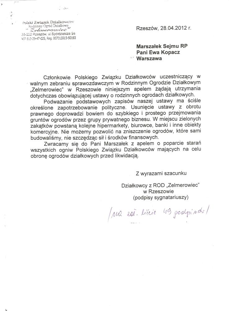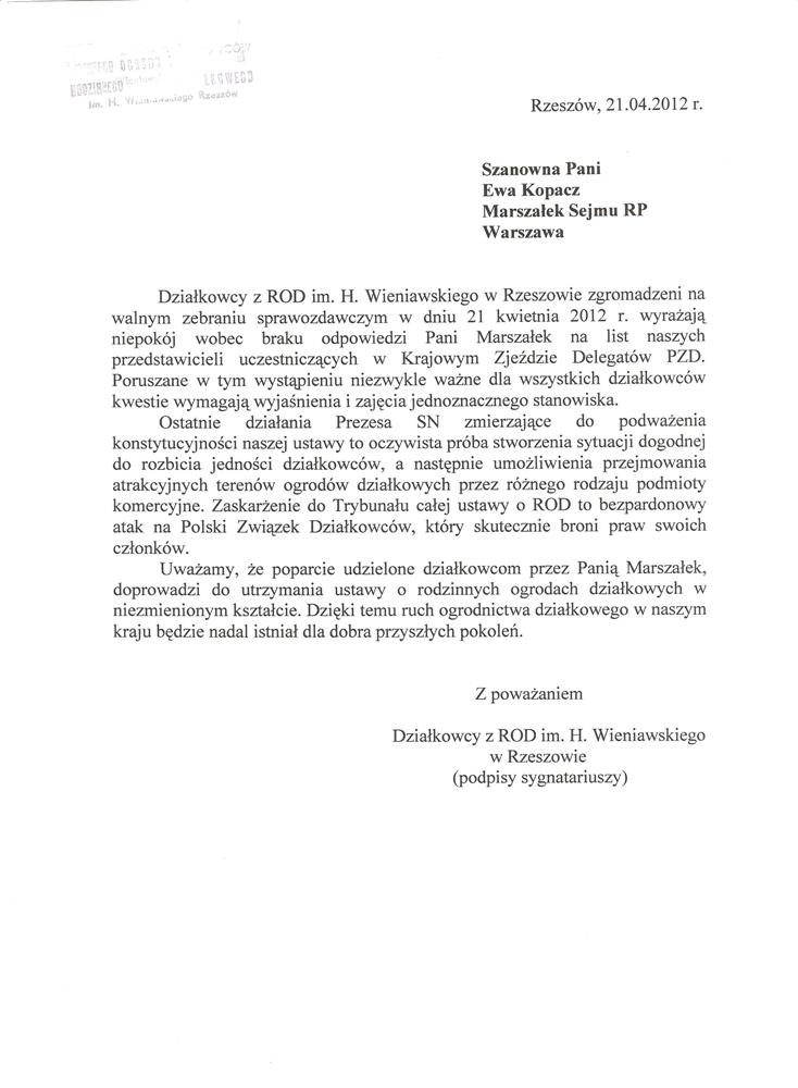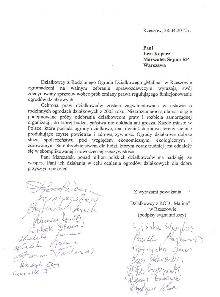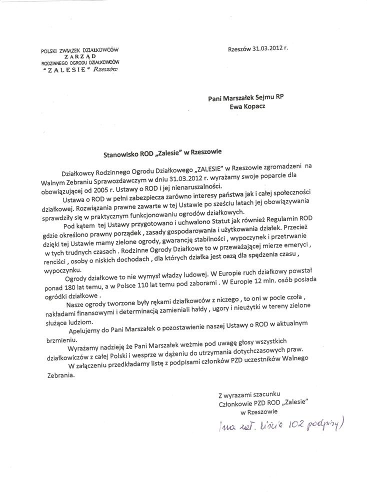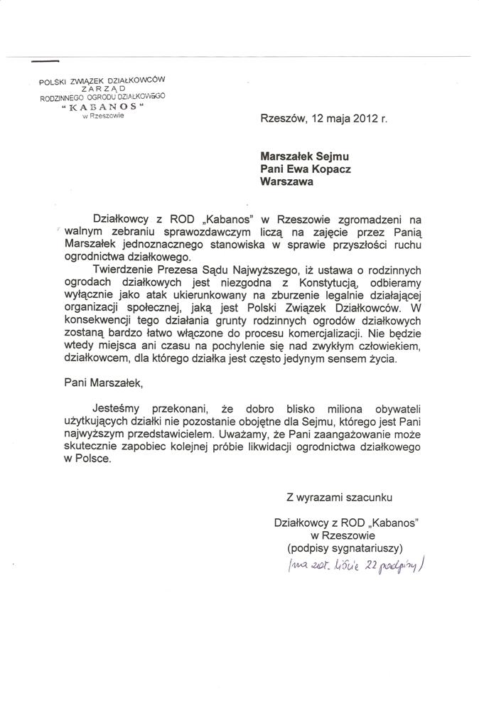 Działając w imieniu rzeszowskich działkowców zwracamy się o pomoc w obronie działkowców, ustawy o rodzinnych ogrodach działkowych i Polskiego Związku Działkowców. Jesteśmy przekonani, że głos najwyższego przedstawiciela Sejmu, przesądzi o pozostawieniu ustawy o ROD w niezmienionej formie i pozwoli na dalsze istnienie oraz rozwój ogrodnictwa działkowego w naszym kraju.